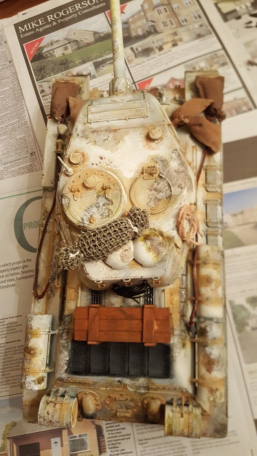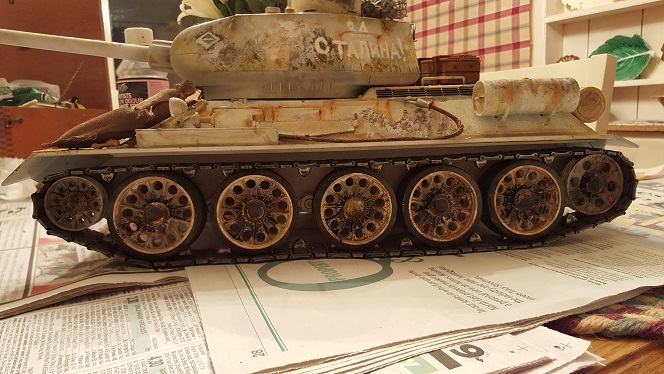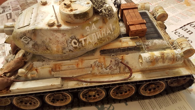 Very impressive corrosion there, almost as if the tank had been abandoned by the sea. Had the Russians never heard of 'Kurust'? Tried, but failed to translate the name on the tank..looks a bit like 'Stalin'.. or 'Stadkna?'. My T34 came with 'CYBOPOB' (trans: 'Suvorov') on it, but written in Cyrillic...Nice job there