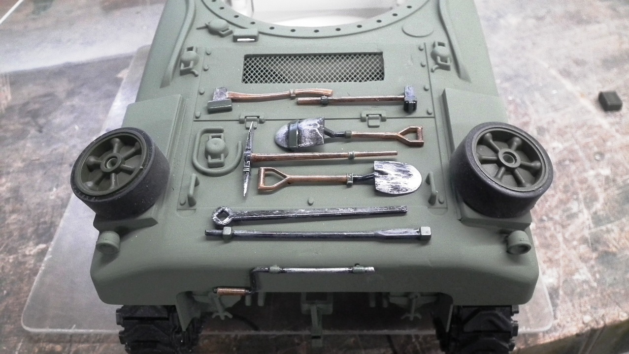 Well I got a bit more done. Finally got the aerial to hold together and fitted, so I put on a first coat of Olive Drab, I weathered a set of tools up and dressed up a set of figures and made a couple of stores boxes and then could not resist taking her to our first anniversary meet.