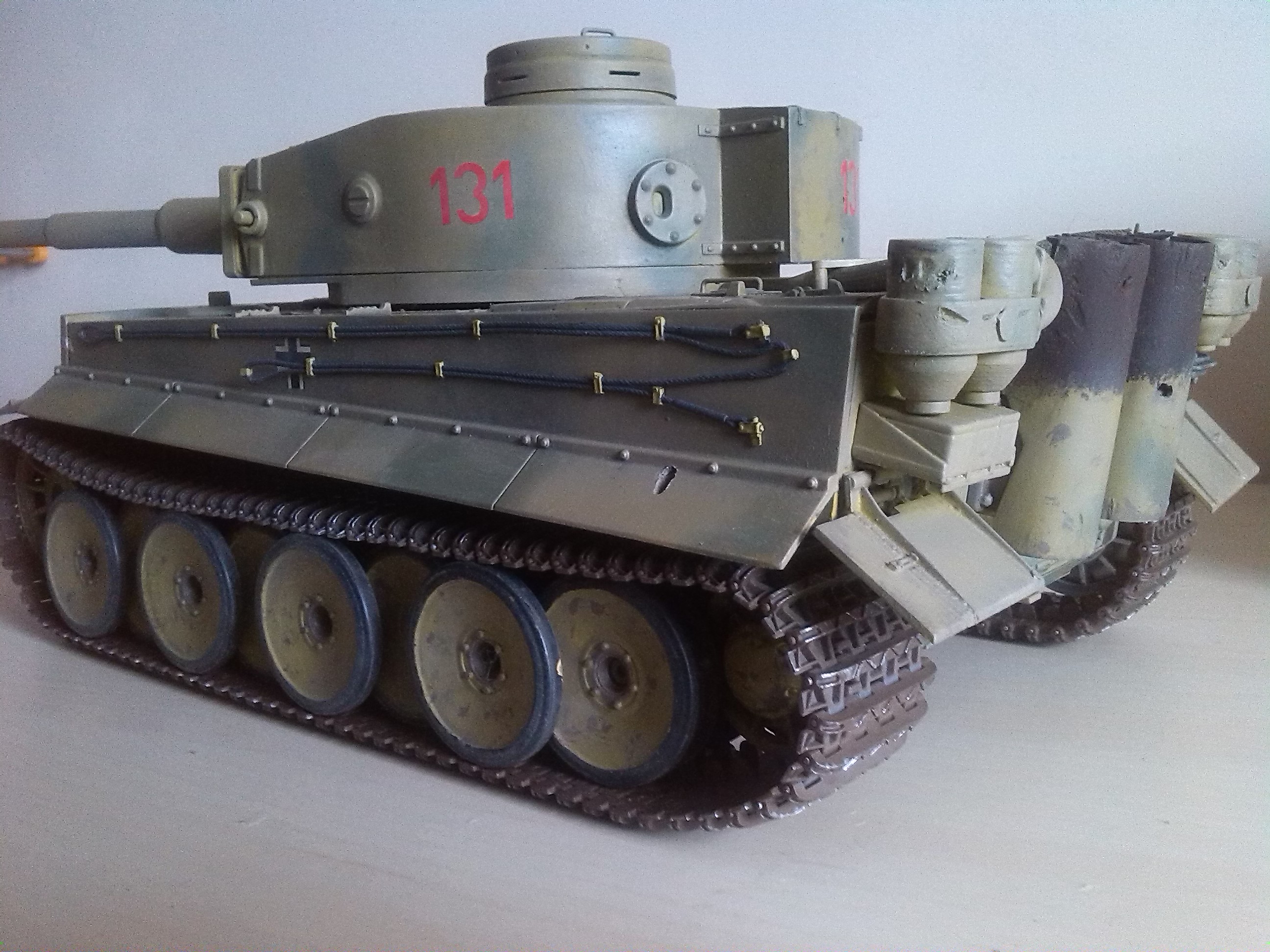 Well this is as far as I can go at the moment. I have decals on the way, but still need to source HL plastic tow ropes, sprocket hub caps, and a plastic smoke launcher. There is nothing inside the Tiger except the gearboxes.