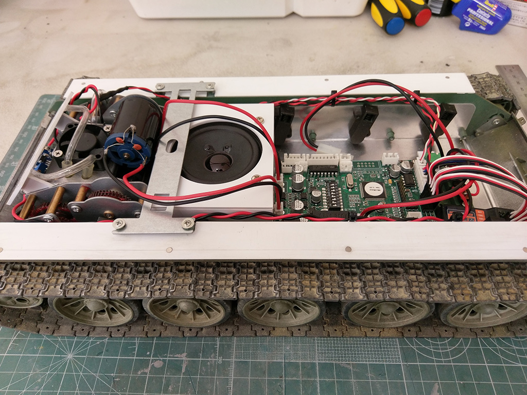 I wanted it to be loud but a different kind of loud, so I did a bit of shopping. A nice big Visaton FRS7 increased the sound of the IBU2 and some high-performance lithium/teflon grease decreased the noise from the gearboxes. At low speed you can't hear them over the speaker, and at high speed it just sounds like drivetrain noise.