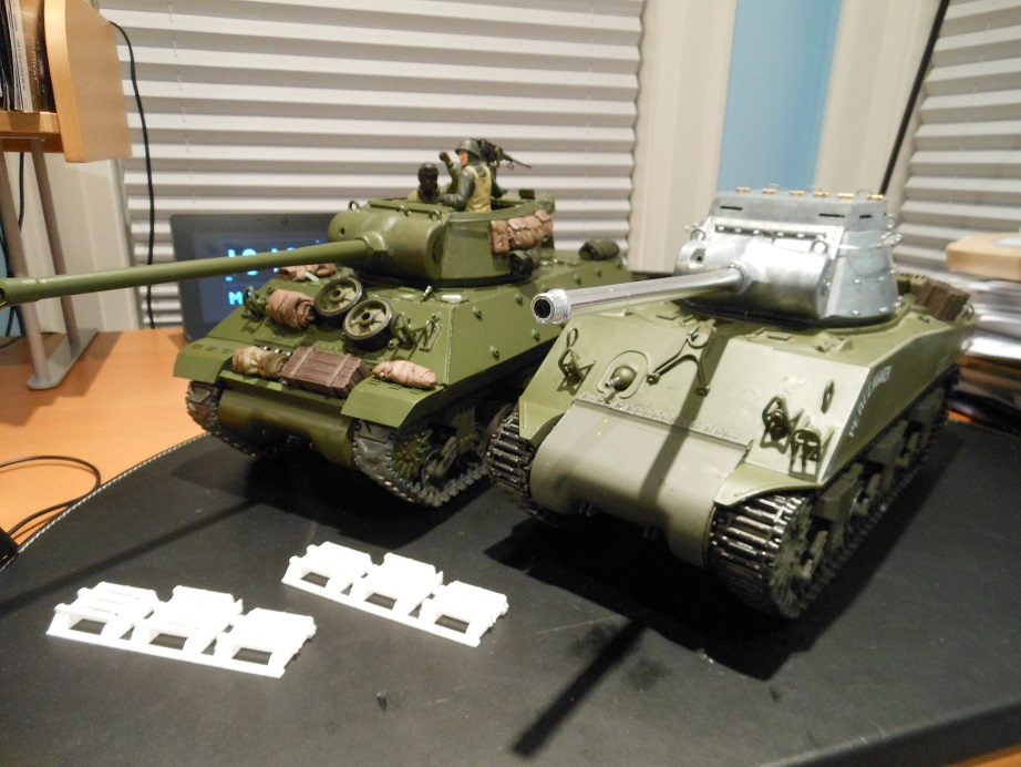 Been working on the M36s......... The M36 has a Heng Long lower with Mato bogies, upper from the M10 kit, and the turret is the Nick A. resin turret. Shapeway racks still have to go on as well as track mounts coming from a Sherman parts bin. The M36B1 has a metal Heng Long lower, plastic Heng Long upper and the new Heng Long all metal M36 turret just arrived from rctank.de. It comes with servo recoil and elevation as well as the armour cover. Quite the piece I have to say.