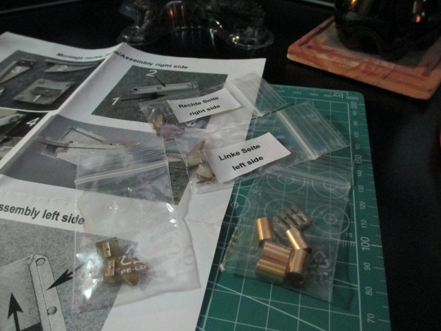 Continuing on with Step 27 ( and it's variants ) Sassgrunt had sent along a set of beautiful Schumo 'S' mine launchers for an early Tiger. I pulled them out and checked all of the parts and proceeded to install. They are solid in a way that only nickle silver and 3D brass is and assembled and mounted beautifully all the way down to the last set which was for the Left rear. There I discovered that Schumo had shipped this set lo' these many years agone with two right side braces instead of a left and right for the two rear mounts. I went ahead and drilled and mounted that last set and will either locate a brace or build one myself out of styrene. Irritating but what can you do? Pics: