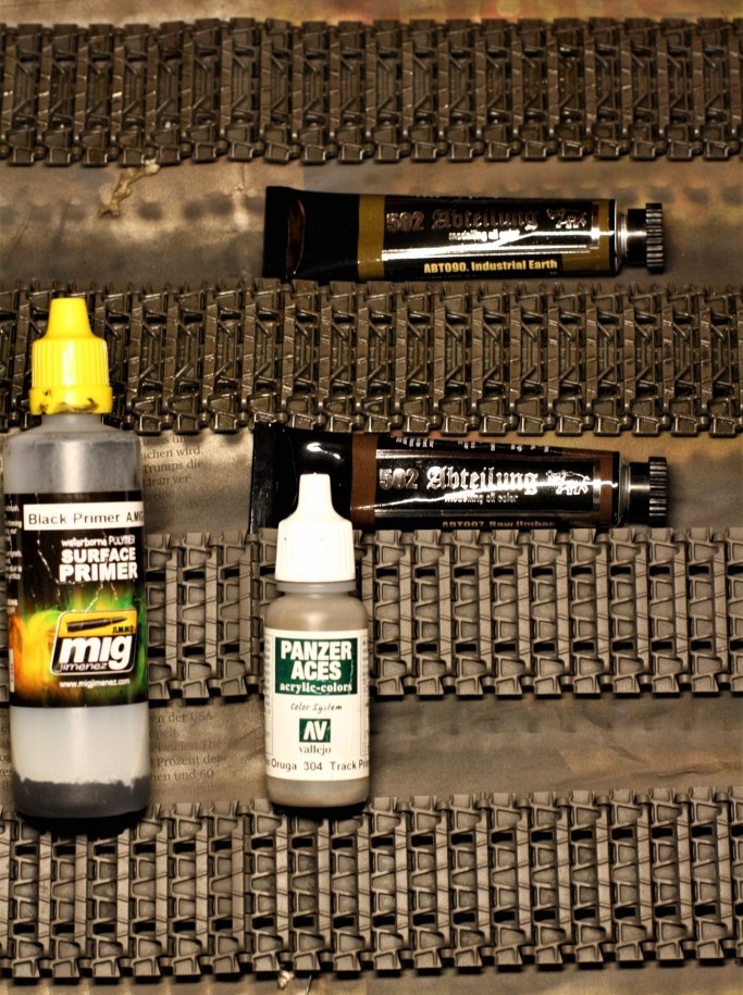 Primed in Mig Black Primer, followed with nice thinned down Vallejo Panzer Aces Track Primer (pair below) and washed with thinned Abt 502 Industrial Earth with stippled in Raw Umber (top pair). Painted last evening the oils still need to dry.