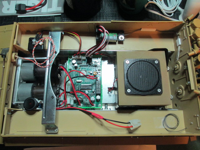 The right tools make all the difference in the world between fun and drudgery. This is a lesson I seem to have to keep relearning as time goes by. The new Dremel is a Jewel among Butane Torches. If you ever have the chance to nab one on sale, do so. I took the first free afternoon in a couple of days to work on the Tiger again. Tonight was more electrics including the Sound Pot, the Receiver and adjusting the On\Off-Battery wiring. All three pieces are mounted and should work nicely. Tomorrow, I hope to be able to work with the lights and MGs. Pics: