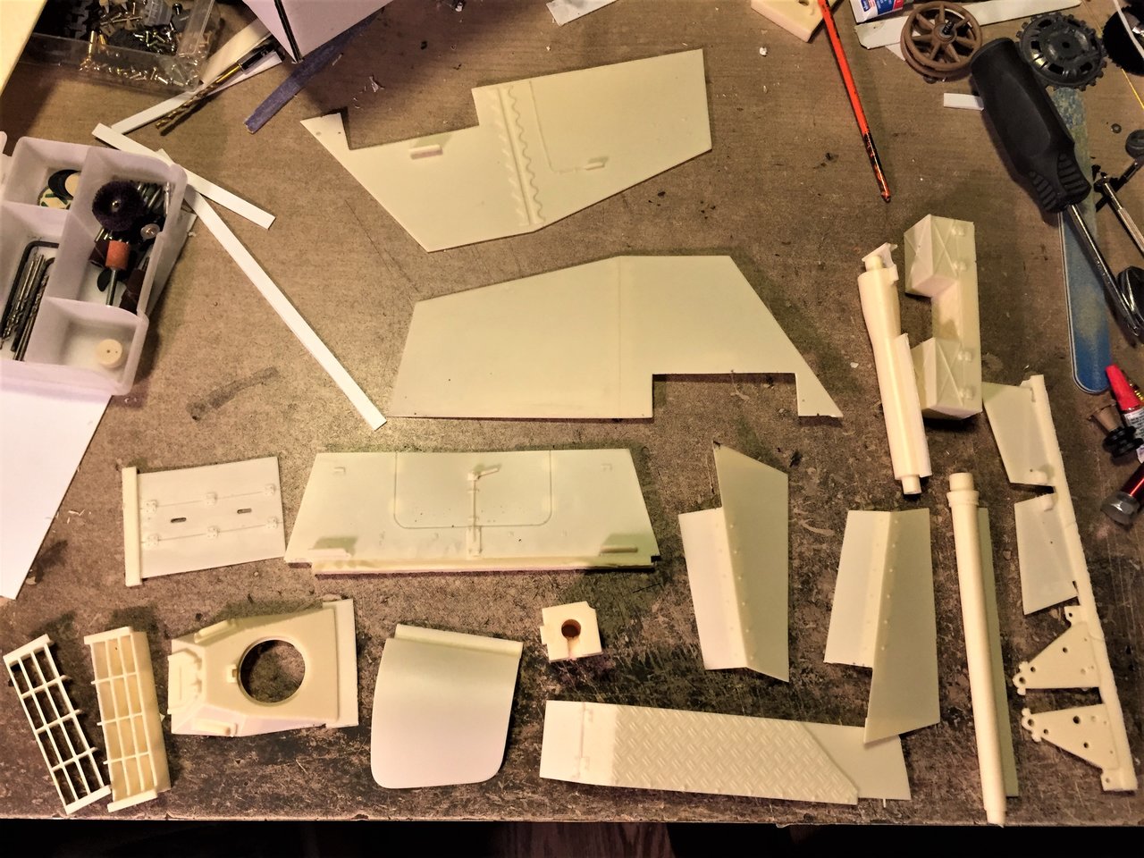 Recent scratch builds by Alwyn Turner and Carl inspired me to build the Juckenburg kit that has been sitting on the shelf for a few years. For many guys like me who switched from 1/35 to 1/16 RC, accuracy remains extremely important. What I thought would be a quick build of an off the shelf kit with a focus on RC functions is turning into a very complex salvage operation. Most resin parts are warped and have air bubbles, something I have not seen since the early days of resin. But that is being fixed with hot water and putty. No, the main concern is accuracy. I built the tub of the upper hull as per instructions just to determine its total length so that I could see how I would adjust it to fit the lower hull that I extended by 7mm at the front. I earlier noticed the fighting compartment was a bit short so the plan is to extend it by 7mm at the rear to compensate and all would be fine, right... Armed with all the Nashorn references I could find, I quickly determined that the gun seat, rear compartment panels and floor are not looking right. It does not look like ref pictures or the 1/35 Tamiya kit. It's disappointing when you spend money on a kit. An open hull like this has to be accurate for me to appreciate it. I will have to cut the tub in pieces and rebuild some of it with plastic card, at least what is obvious. I wonder why the kit designer did not use an accurate 1/35 kit as a model and just do something that looks like it instead of inventing shapes and parts... It would not have taken longer. Attached is a pic of the Juckenburg upper hull tub and the Tamiya 1/35 for comparison. I did not look at the gun parts yet. For now, I will focus on the lower hull... One thing at the time.