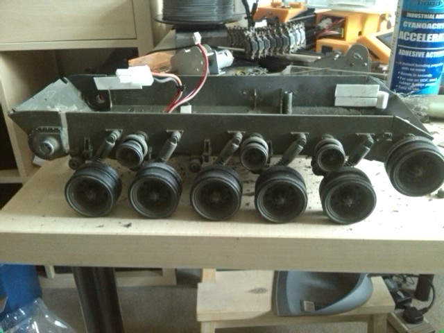 Yup, I didn't notice that about the opposing suspension units, I was too busy looking at the fwd problem. If I was doing this again I would chop out two roadwheels and turn that section around. I would really need a bandsaw to do that and keep everything square, but it would definitely be the way to get it right. Then of course I would have been able to narrow the hull by 9mm (max in view of the gearbox/motors width. However seeing as I don't have a bandsaw...