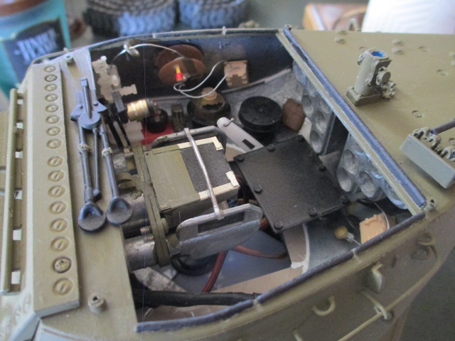 It was a beautiful, quiet Sunday here. I planned on getting out into the Lot and doing some work but as it turned out, the closest I got to that was playing around with the puppies at lunch. ;o) The turret interior is done minus a pin wash and a few brass rounds ( brass nails ) in the ready rack. I'll attend to that after the Holiday. Pics: