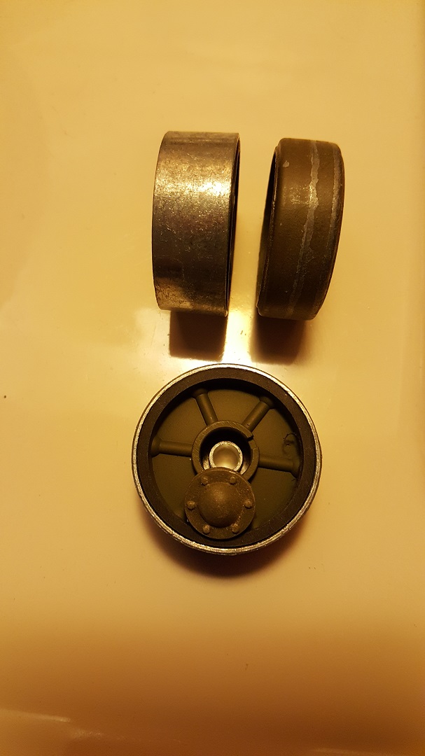 Modified idler wheel mounted combining the HL wheels correct appearance with the correct width of the MATO wheel on the tracks