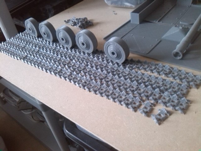 I gave up on sticking two halves of tracks together and drilling the pin holes, there are waaaaaaay too many of them for me level of patience, so I now have a container full of hundreds of track halves. When the new printer arrives I will just print the links in one piece. I have done some on the existing printer and they aren't too bad. I just need to be able to print a lot more at a time, which the new one will do.
