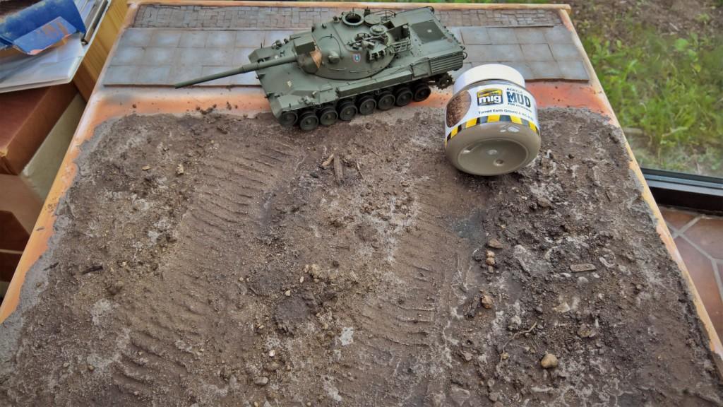 Added garden soil with PVA in water. When thoroughly dried it gets lighter I hope. Anyways I have to blend These two colours bevor adding "The Green". Apropos green. That is my Interim Project: a Revell Leopard I in Dutch colours.