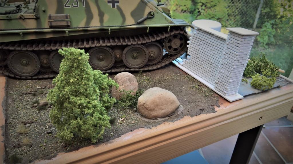 Here I painted the soil, the mixture with PVA didnt lighten up again ,stayed like wet unfortunately. So even acrylic Fixer has another formula as it dries true. I had some Pasture mix lying around and gave it a thin coat and a bush and testfitted the tank. Have to resculpt the area where the tanks meets the ground and have to find a way to get higher grass into the Scene.