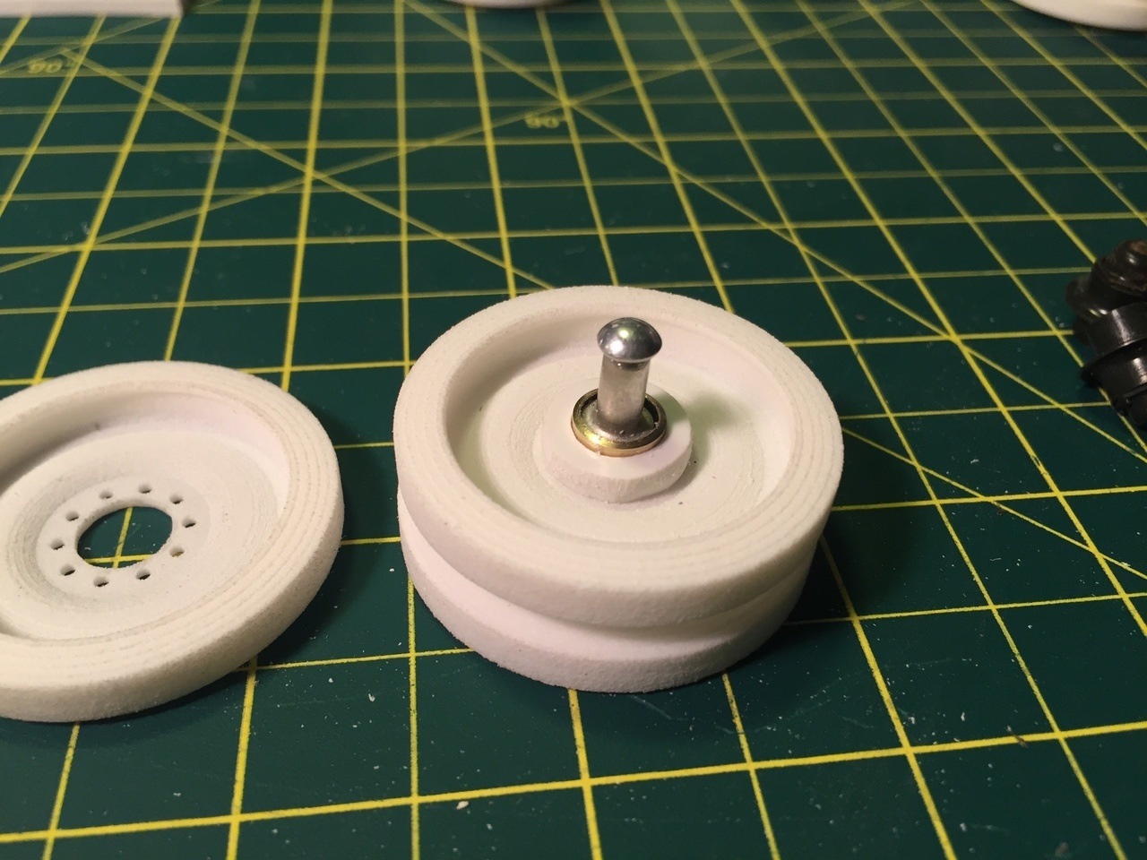 A round plasticard spacer is put between the 2 wheels to have the right spacing between them.