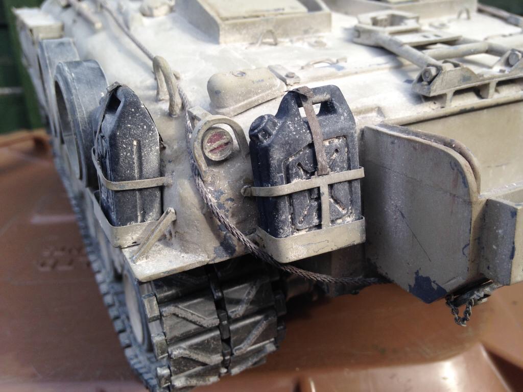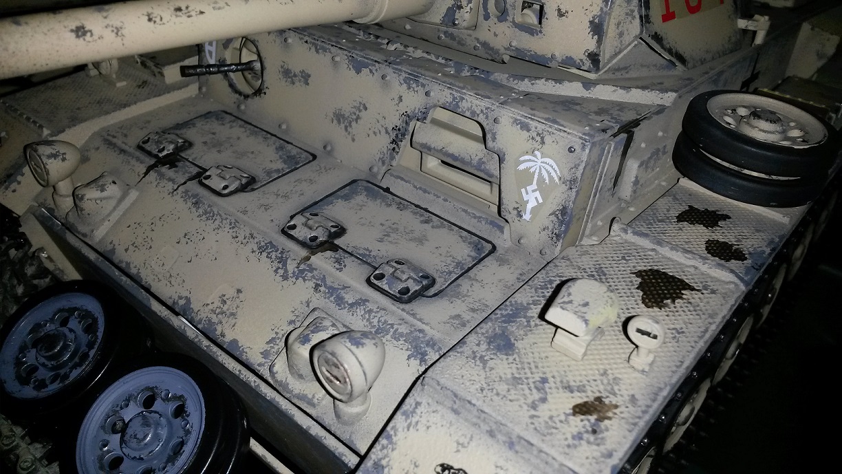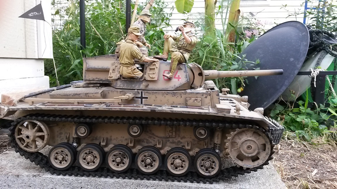 This is my DAK Panzer III. It was an ebay rescue that came with metal gearboxes. I added metal treads, road wheels, suspension arms, and return idlers. Replaced the non opening turret hatches with PzIV opening hatches and scratch built the rear jerry can carrier.
