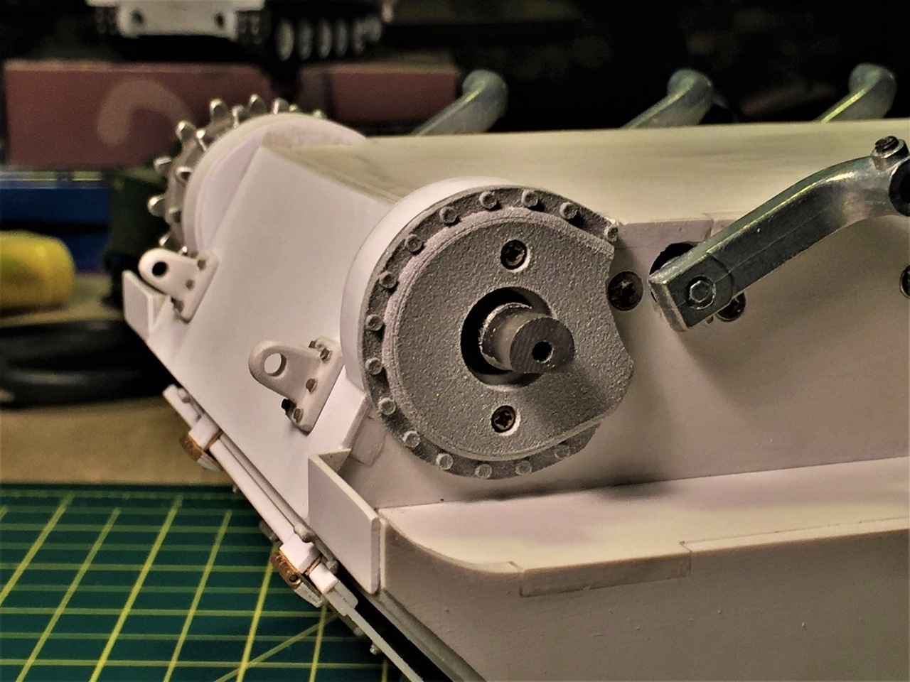 The frontal area is highly visible and this is the look I was looking for with the sprocket on. Notice that I started to file the dents of the sprocket. Now it runs much better with the tracks on.