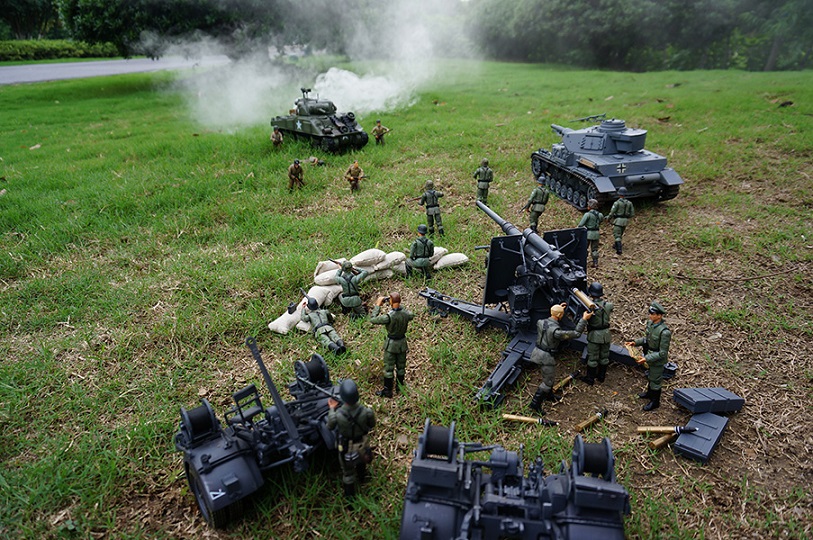Nicely staged and imagined. :thumbup: The figure and vehicles blend convincingly.The one exception, perhaps, is the Sherman tableau in the final pic. If the proportions are correct there, then the GI on the turret would be around 8ft tall. Small matter, and thanks for taking the trouble to mock the battlefield up, and then to post the pics here :thumbup: If asked to single one out as a favourite, it would probably be that of the gunpit and gun crew.