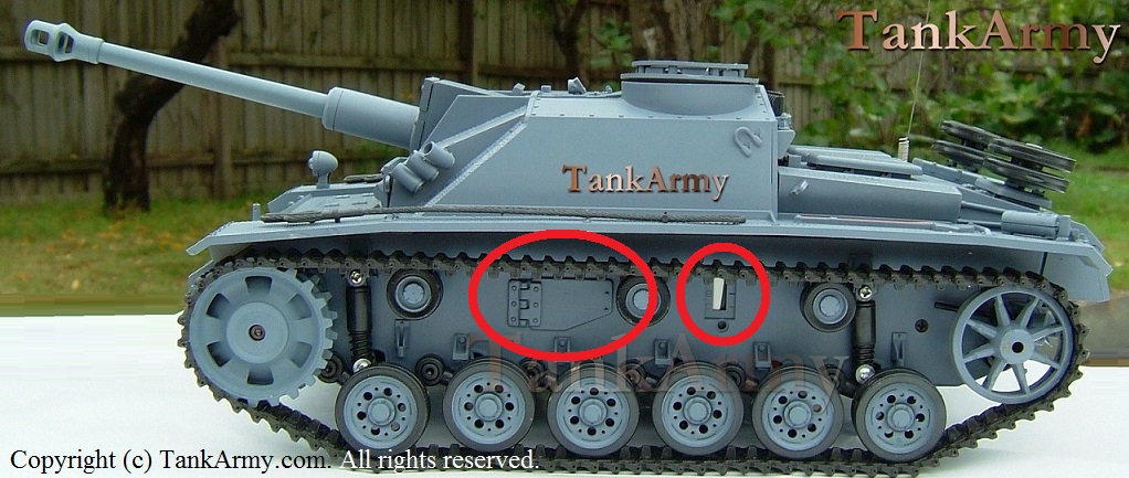 Like the real thing, Heng Long uses the PzIII lower hull. It is not surprising as they are identical apart from the side escape hatch that apparently only 30 or so early Stugs had and not the Ausf F or Ausf G. (Edit: just read in Panzerwrecks 7, that 170 Stugs were built with side escape hatches in 1944) Also, there is a slot that appears to be for the old style receiver switch, which needs to be filled.