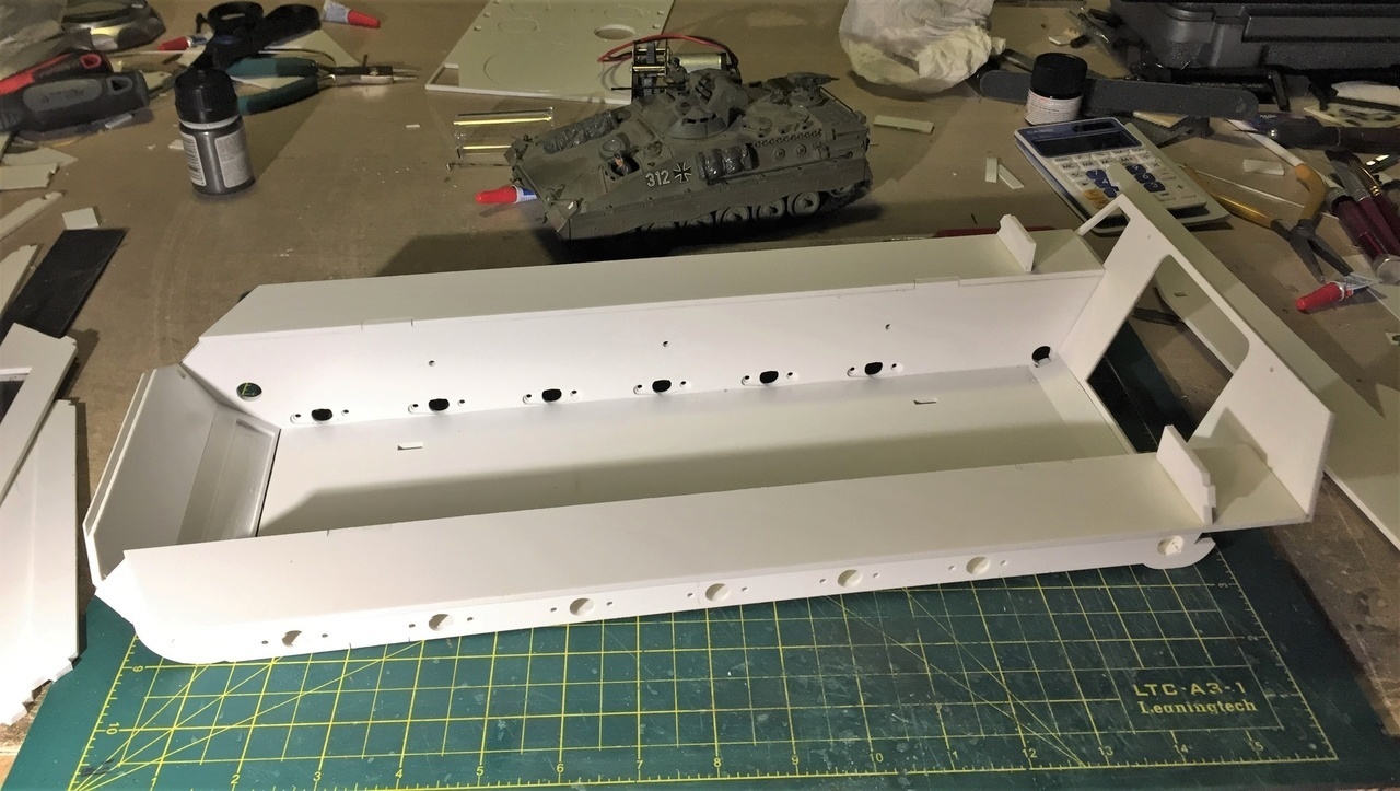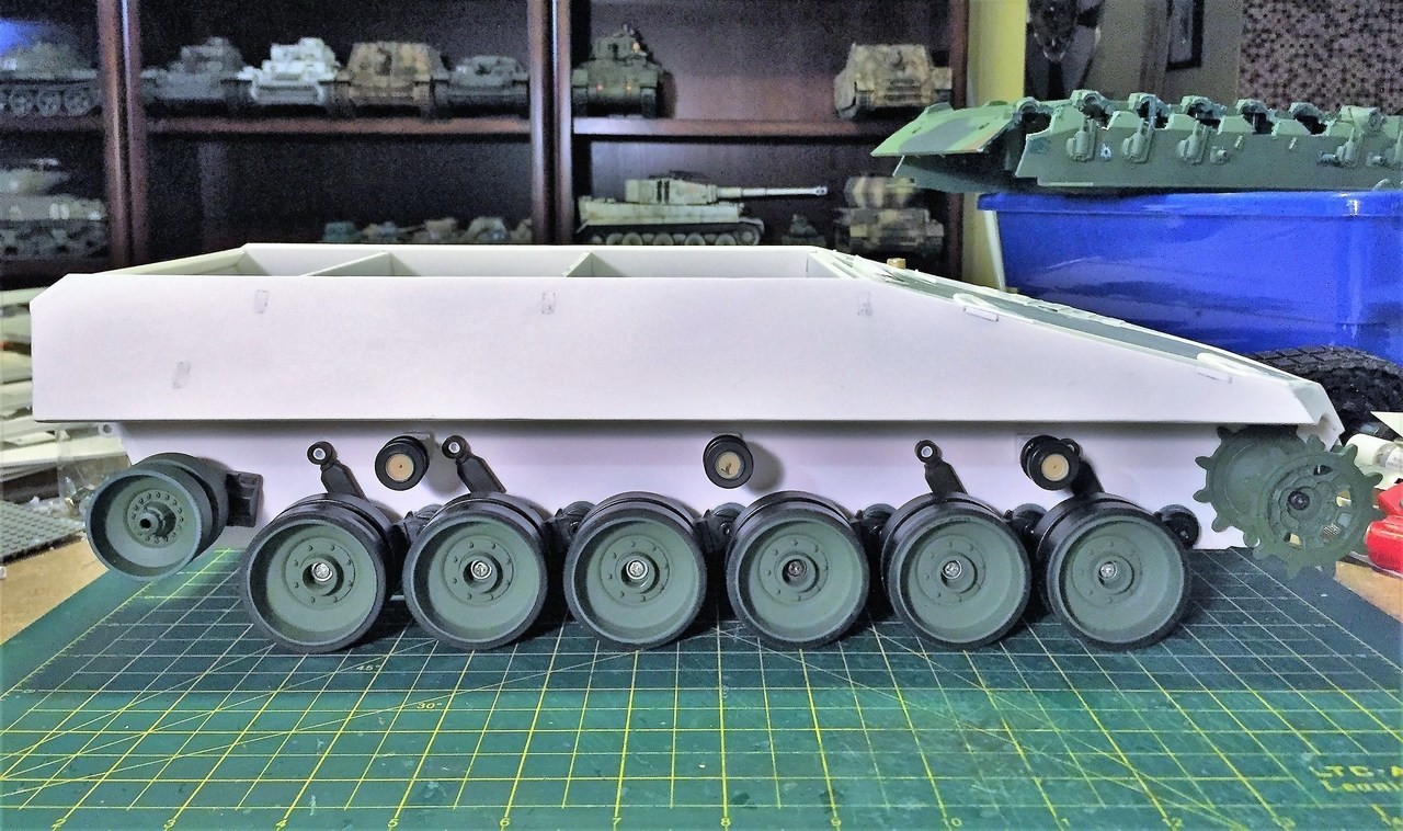 But for now, I will leave the upper hull aside and concentrate on transposing the Leopard 2 suspension to the Marder hull. It is certainly not a conventional approach. Need some more brainstorming now that the lower hull is ready. Hope this will work out.