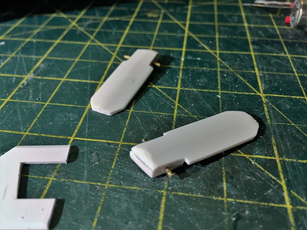 Getting ready to install the engine cover. I realised that the hinges parts provided with the kit (on the left) were of only a vague resemblance to the real ones and were too small, so I had to make new hinges by copying those on the Tamiya kit, and double checking that size and shape were as per photographic reference. They also have various angles to repro so these are no mistakes.