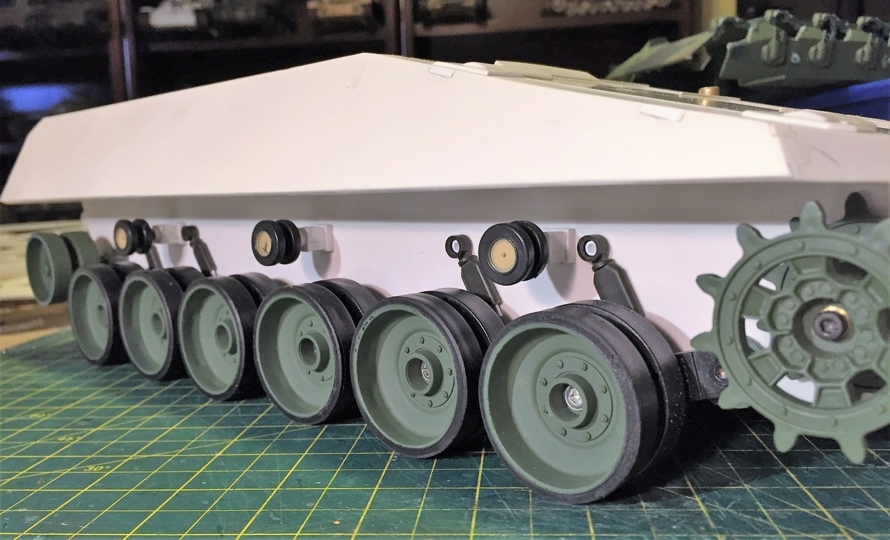 Marder suspension arms are installed, aligned, looking good and working fine, exactly like when they were on the Leopard chassis. It was a 5 hours operation end to end, including the prototyping. The road wheels can simply be attached to their arms with the HL screw. A much simpler task than trying to figure out a way to put HL wheels on Tamiya shafts.