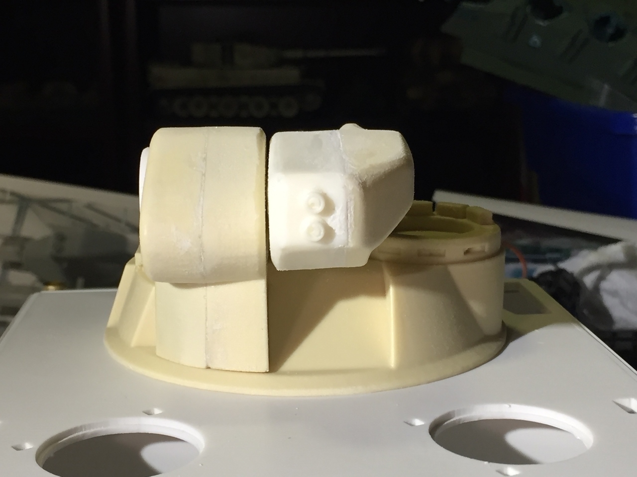 Here it is. the turret core. It only got its first coat of putty and sanding, a lot more is required to plug the gaps, distortions, air bubbles and to make it smooth and accurate. A smaller 4mm aluminum tube will be inserted into the left ring of the turret to hold the IR box that needs to be scratch built.