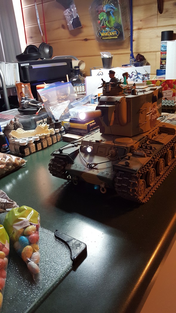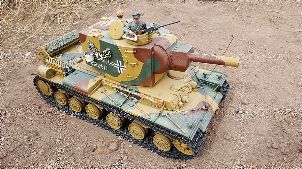 Bringing the 'Crackerbox Palace' back for another go round. ( New outdoors rough run and photo set ) Built by me from a Taigen KV-1 metal version and Torro KV-2 turret into a German Beutepanzer, a 754(r). Paint is mine and is tri tone Malta Invasion camo and applied by brush. Figures are HL stock and resin aftermarket. There is a ton of Tamiya KV-2 detailing and extra brass work added. Pics: ( click to enlarge )