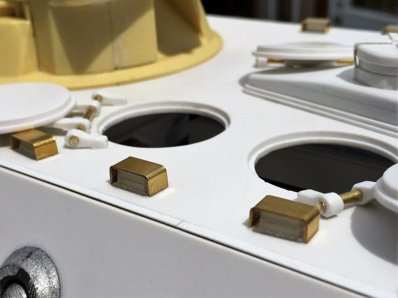 Front hatches have been installed. My pre-purchase of an assortment of 4mm and 5mm wide brass strips from Knupfer has proven essential. Shapeways King Tiger periscopes were used and fit perfectly. The brass covers must be given various angles to fit correctly as they must not follow the slope of the armor plate.