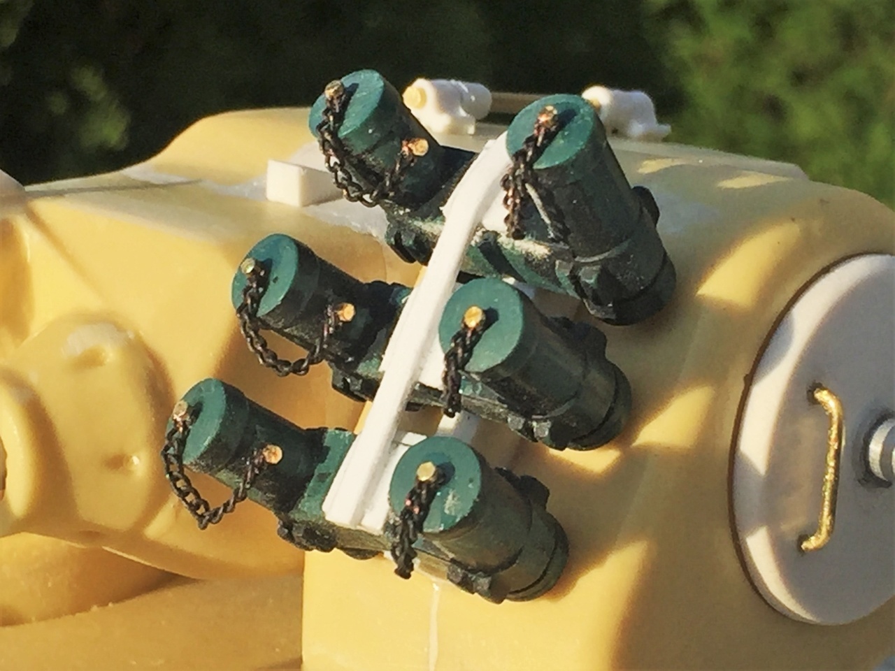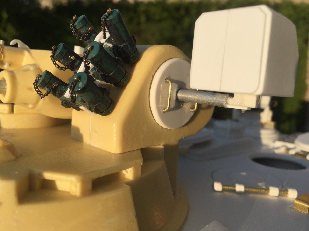 The smoke grenade dischargers are from the HL Leopard 2A6 accessory set. Close up pictures of these are difficult to find. It is hard to figure out the mounting arrangement. They were simply mounted on a thick vertical plasticard strip and positioned sideways in pair, each pair with their individual spread angle, as shown in reference. M0.6 bolts and small chains were used to improve the look.