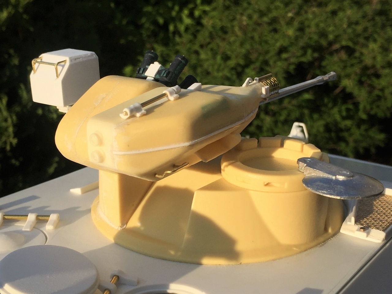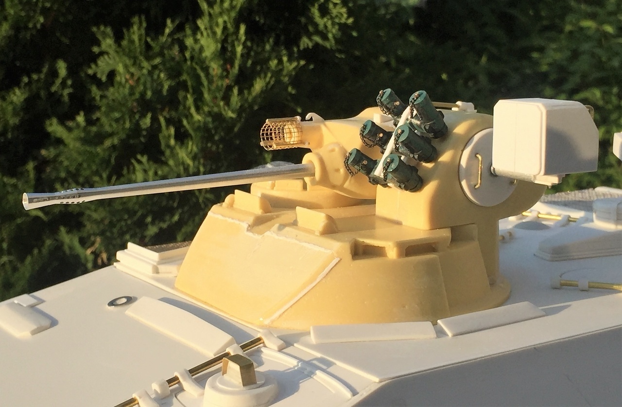 The IR box was scratch built using dimensions from the 1/35 kit and extrapolated to 1/16. It moves up and down with the gun. Only a few shady pictures are available of the 1A1 early arrangement. Be aware that various modernization efforts changed the look of this equipment over time. I did my best.