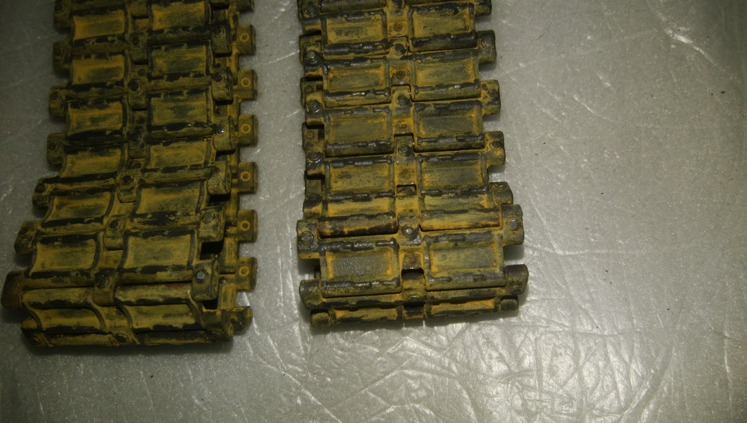 After attaching this track to the tank and running it several times, the painting of the contact surface of the track with the ground and wheels will peel off and become more realistic.