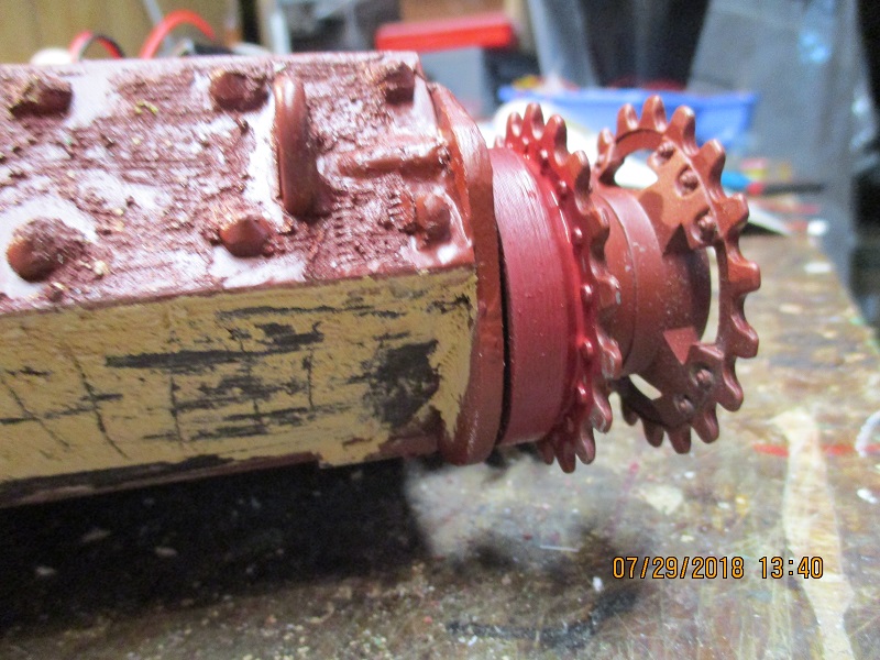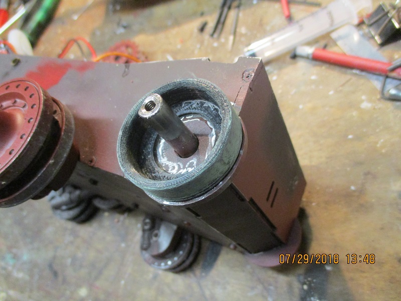 Rear convoy light 3D print. Ran some thick fishing line through for fiber LED 'lighting.' Half of the front track guards done. Wash of Tamiya basic putty thinned w/acetone for steel plate effect. Brass fittings made for rear castle....