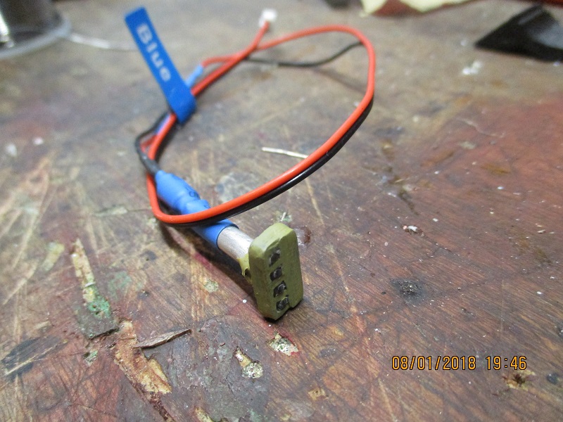 Thx Soeren. Here is convoy light in blue. 5mm LED heat shrink tube to aluminum tube holding the fiber. Luckily, it fit into body without hitting the subwoofer. The LED is plenty bright. I polished the inside ends of the fishing line w/1500 grit, but it was old poor quality line and not very reflective internally. But, I think it's scale brightness (in other words, dim).