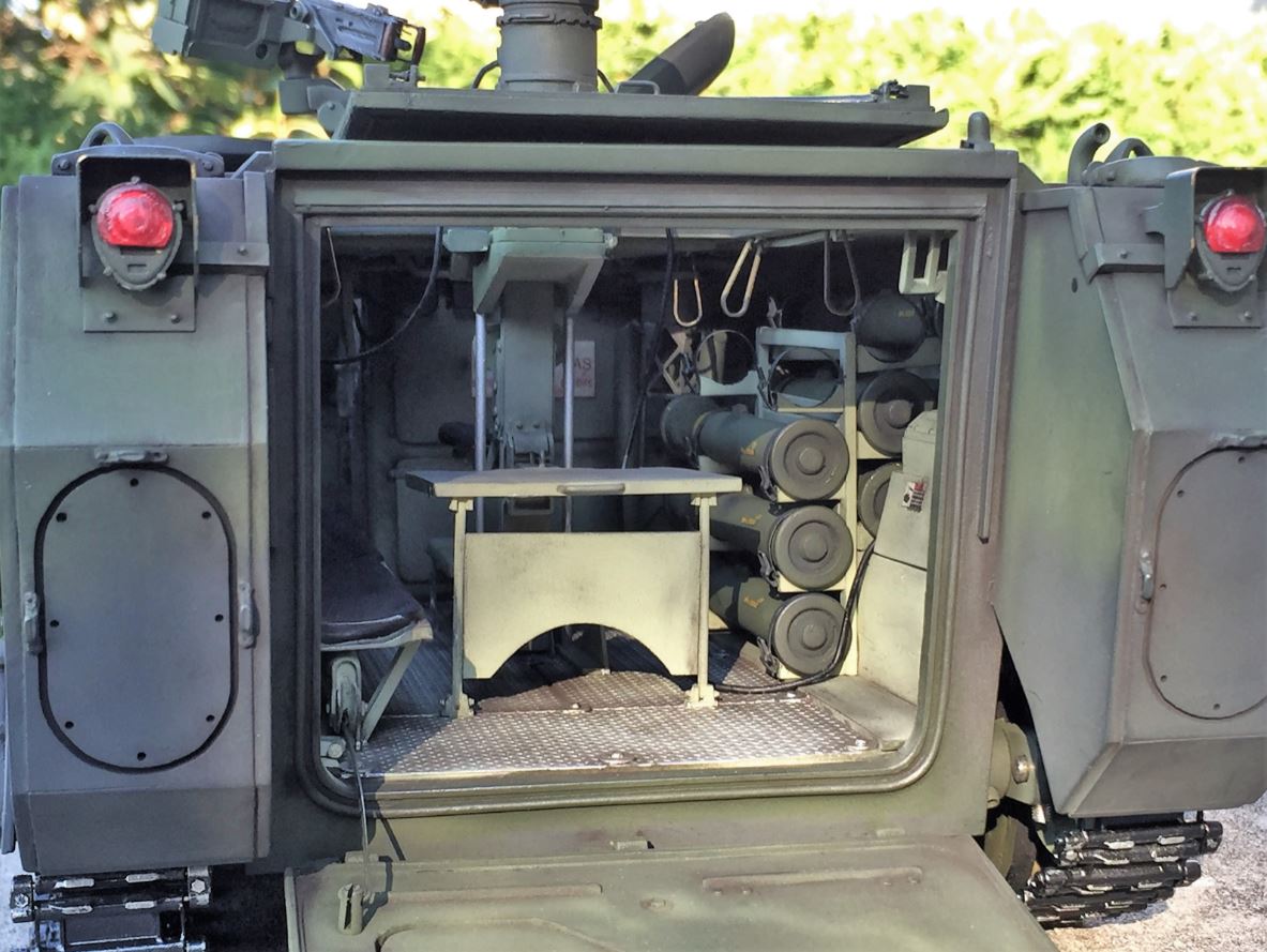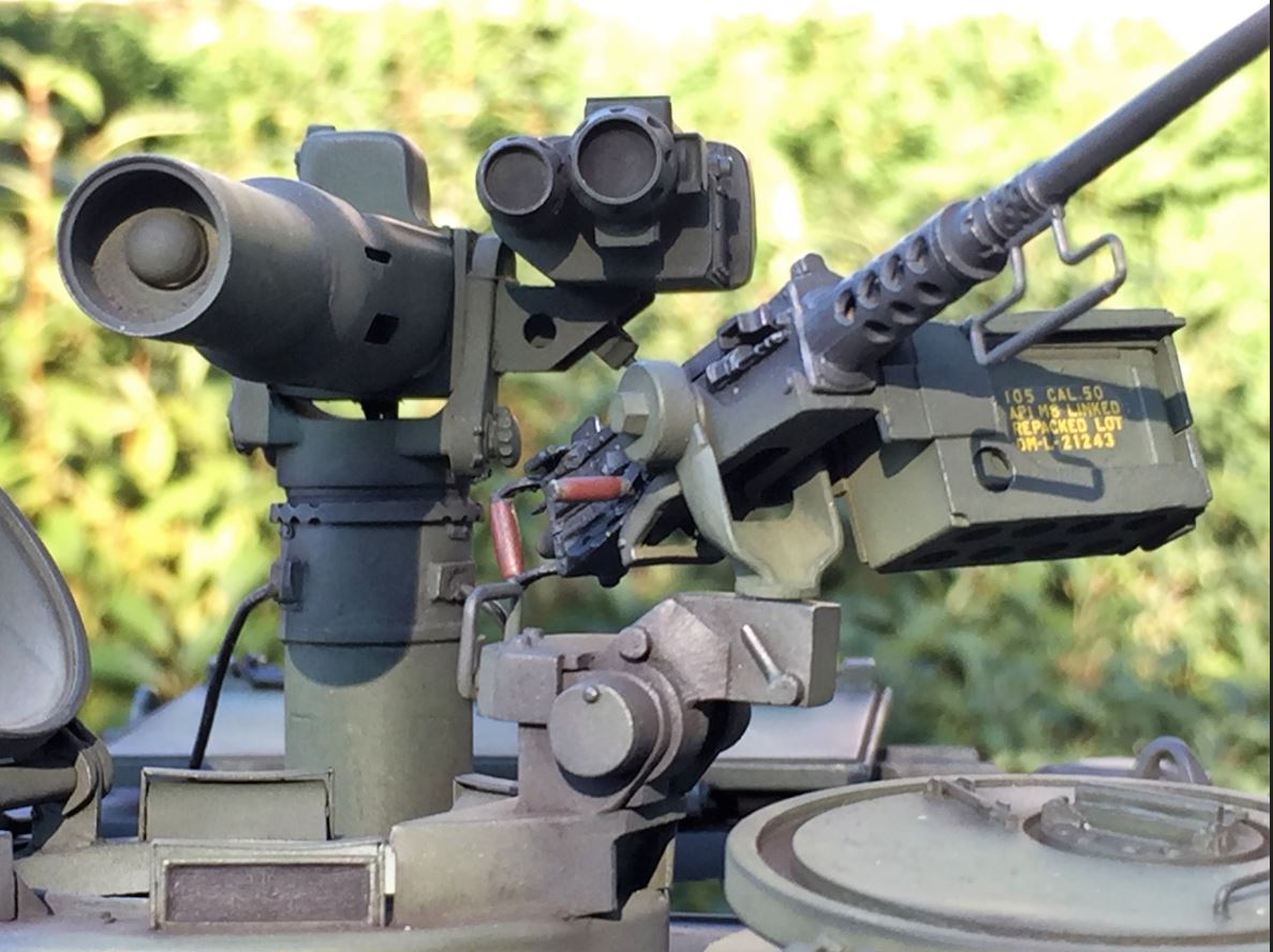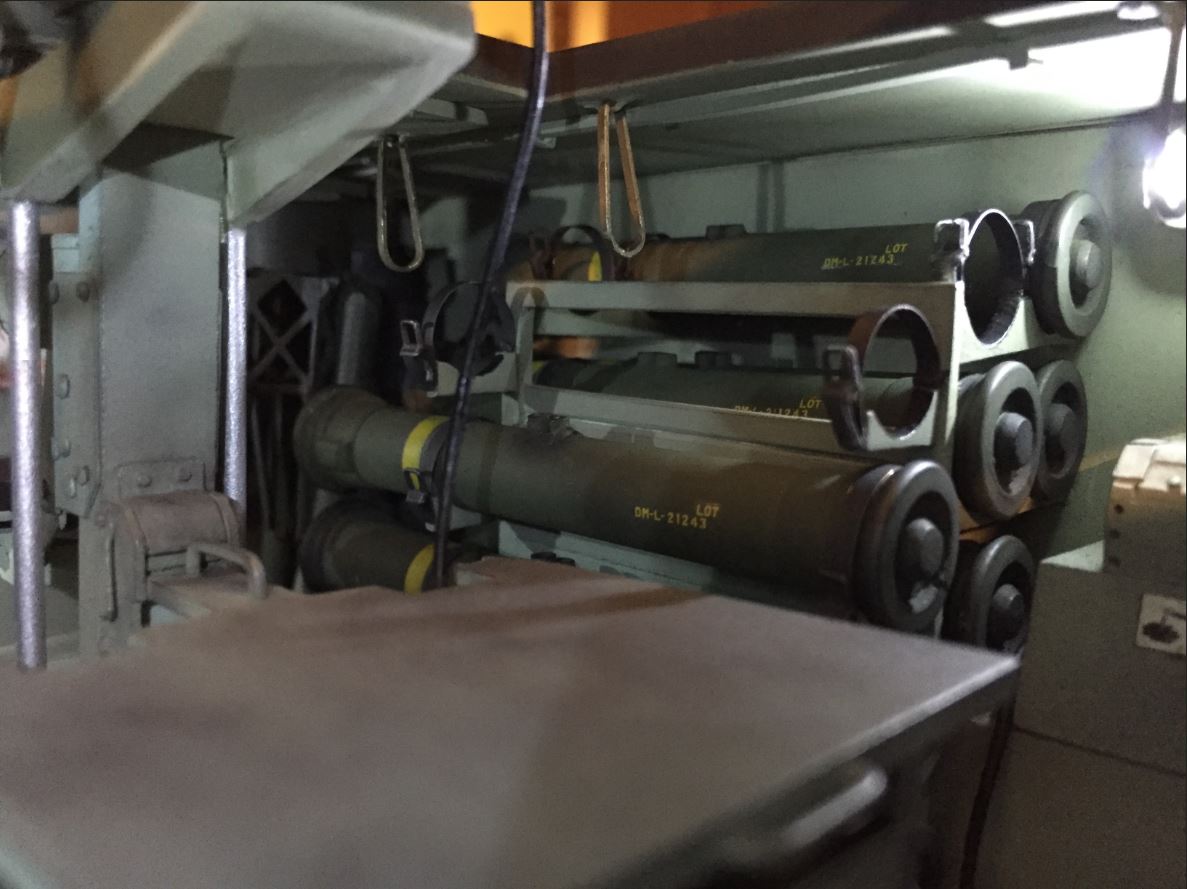Tow missile decals are of course non existant in 1/16 scale. I did paint the yellow line seen in ref pictures. I was able to reuse some Tamiya .50 cal ammo box decals to at least put a Lot number on the missile. The latches for the TOW missiles are brass trips with Shapeways German ww2 tool holder.