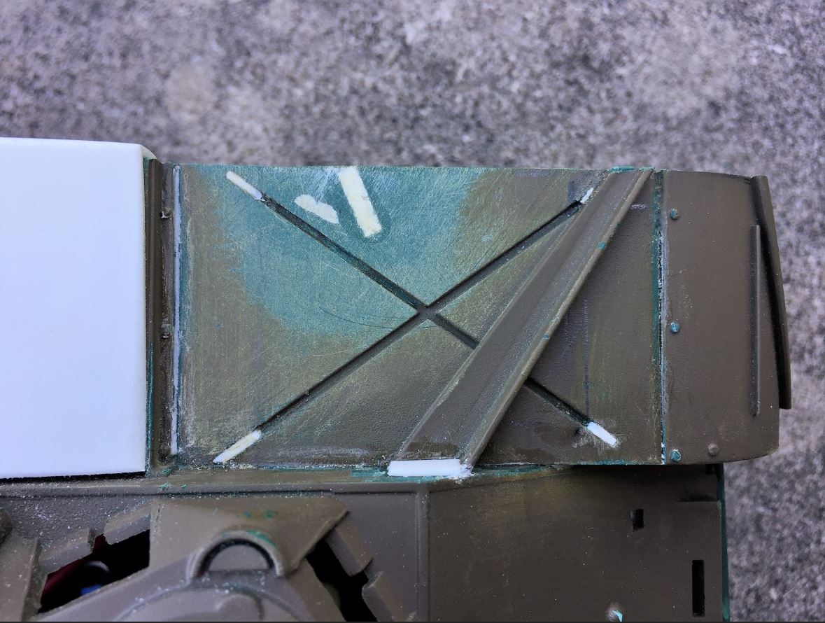 New Plasticard overlay of the right size will be glued to the top of the remaining fender skeleton.
