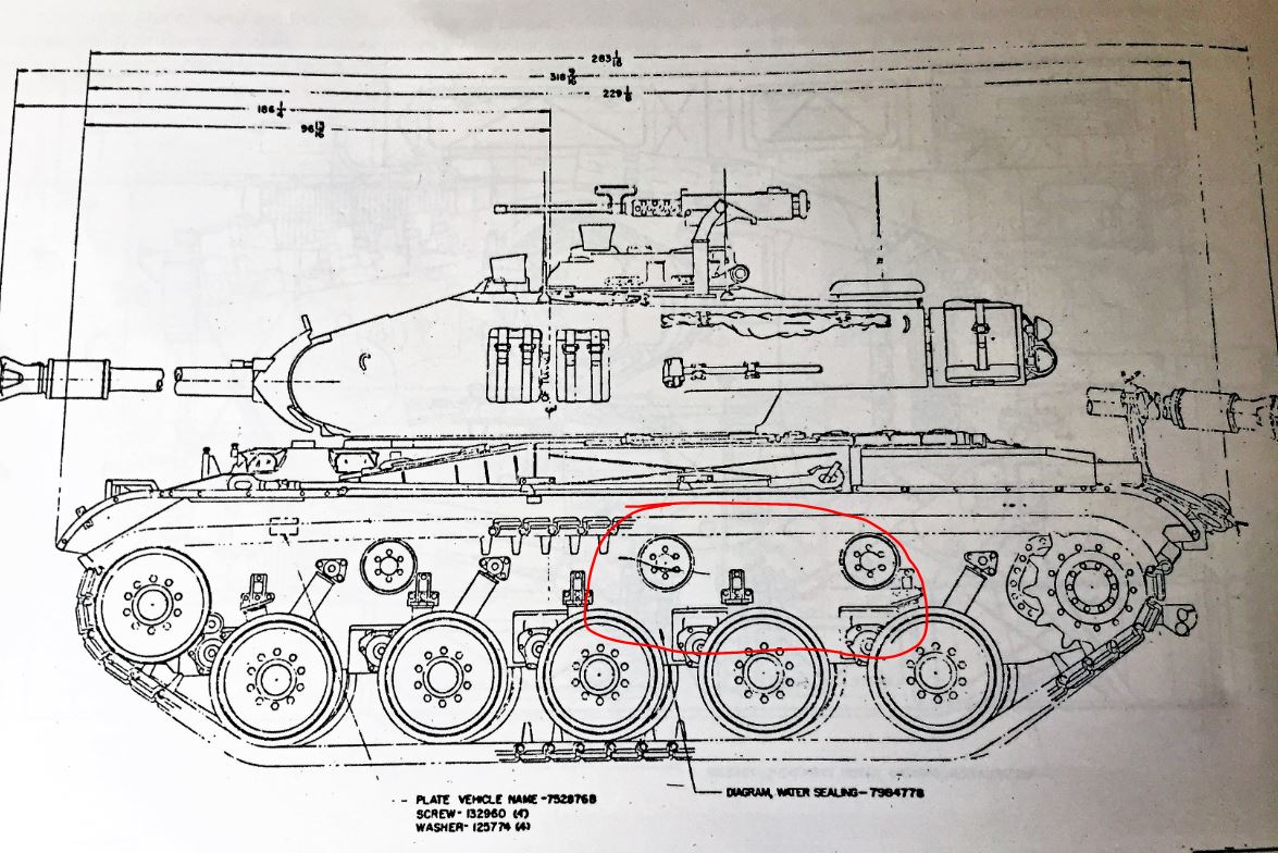 The Heng Long M41A3 suspension is fully handled by the shock absorbers on each road wheel instead of torsion bars or springs integrated with the suspension arms, which complicates things a bit. As shown below, the real M41 does not have a shock absorber on roadwheel 3 and 4. So, Heng Long did cut some corners that must be rectified for an accurate M41 model.