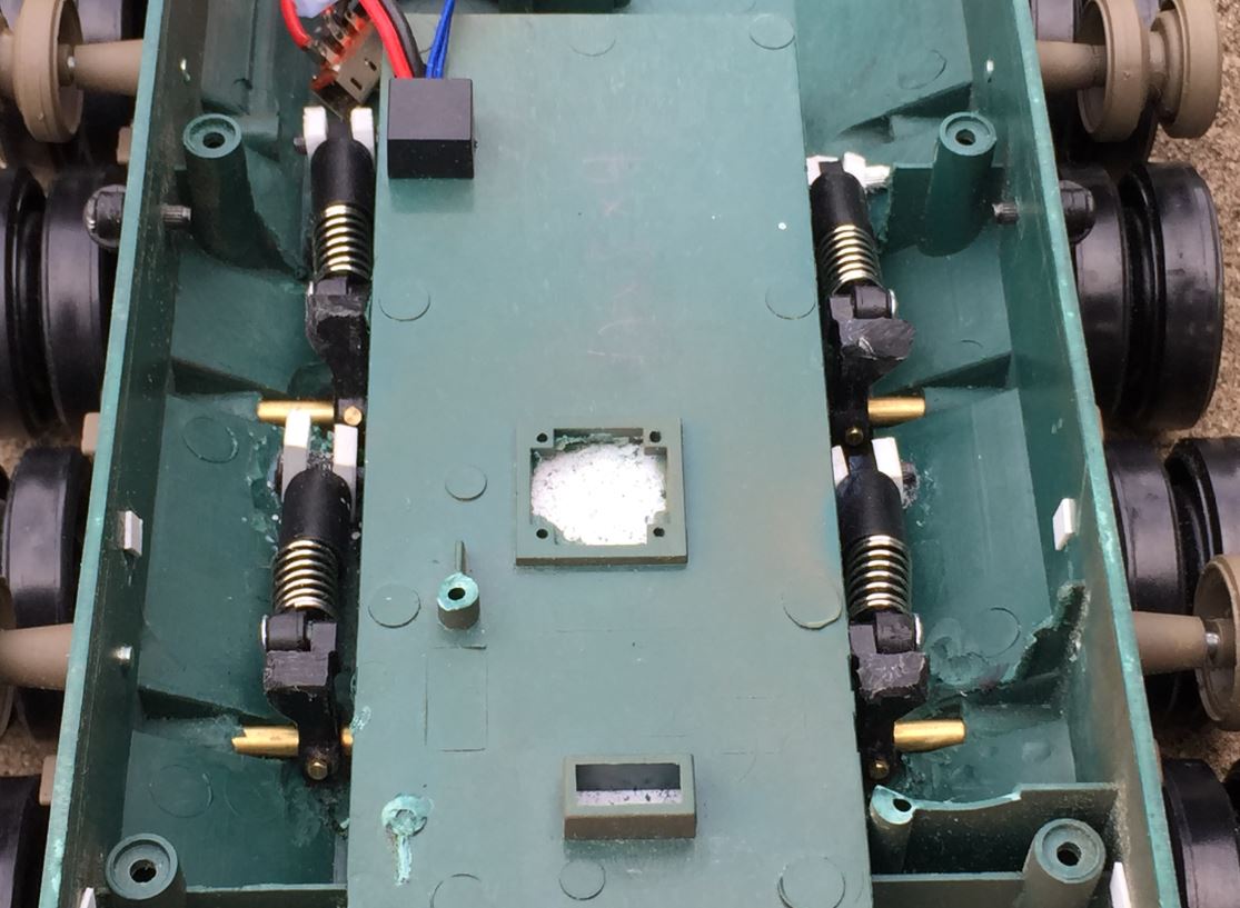 Because the bottom of the inside suspension arm need room to operate, a hole is required to be made at the bottom of the hull for these, it does not show from the outside. Then a 4mm hole is made to go all the way in and even a few mm inside the battery box to provide extra support for the 4mm brass shaft.