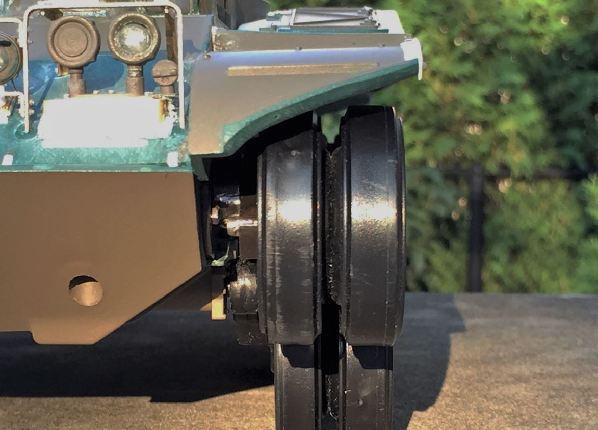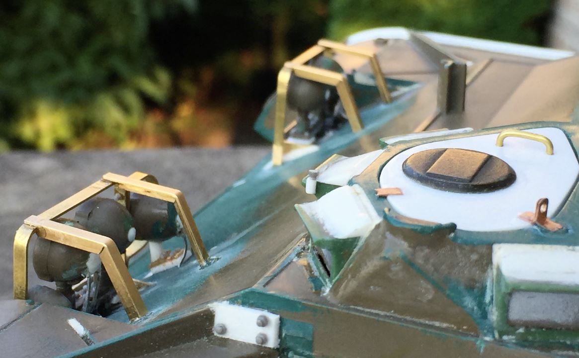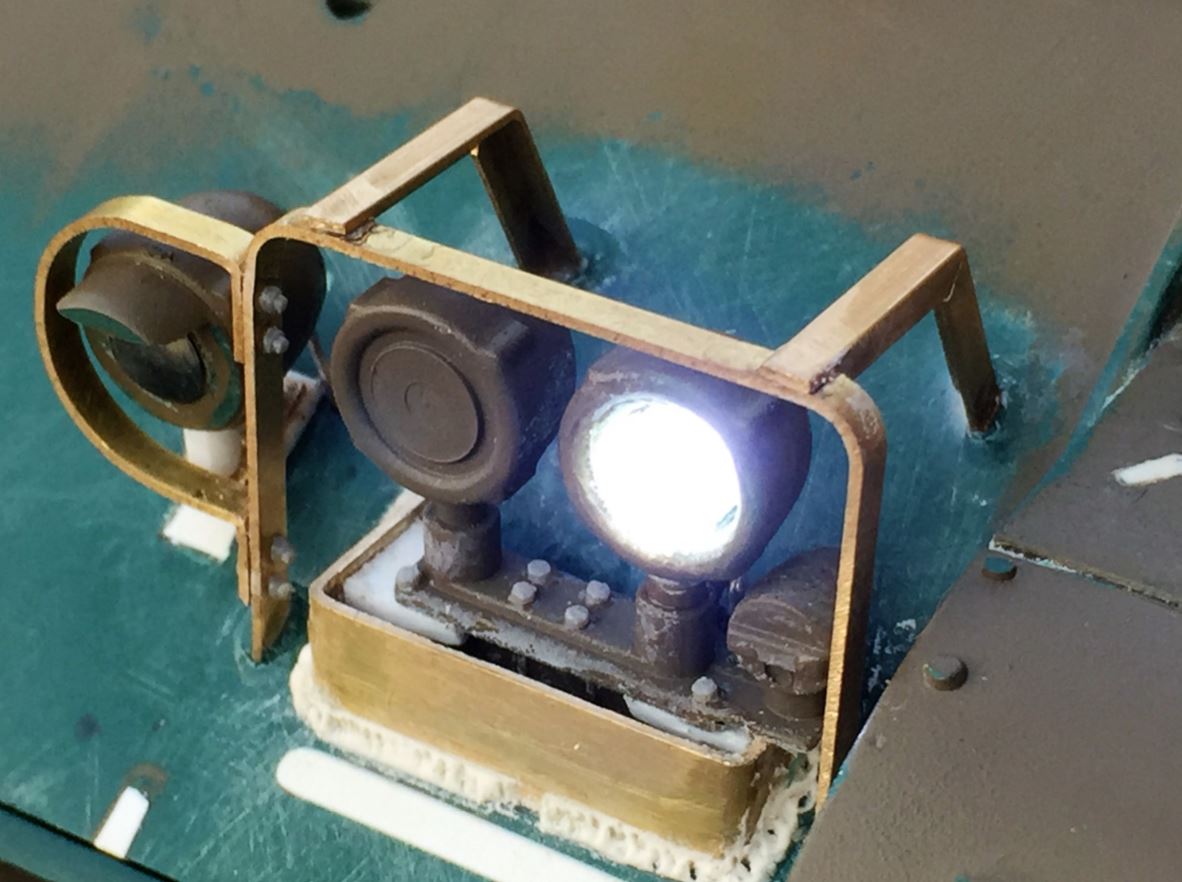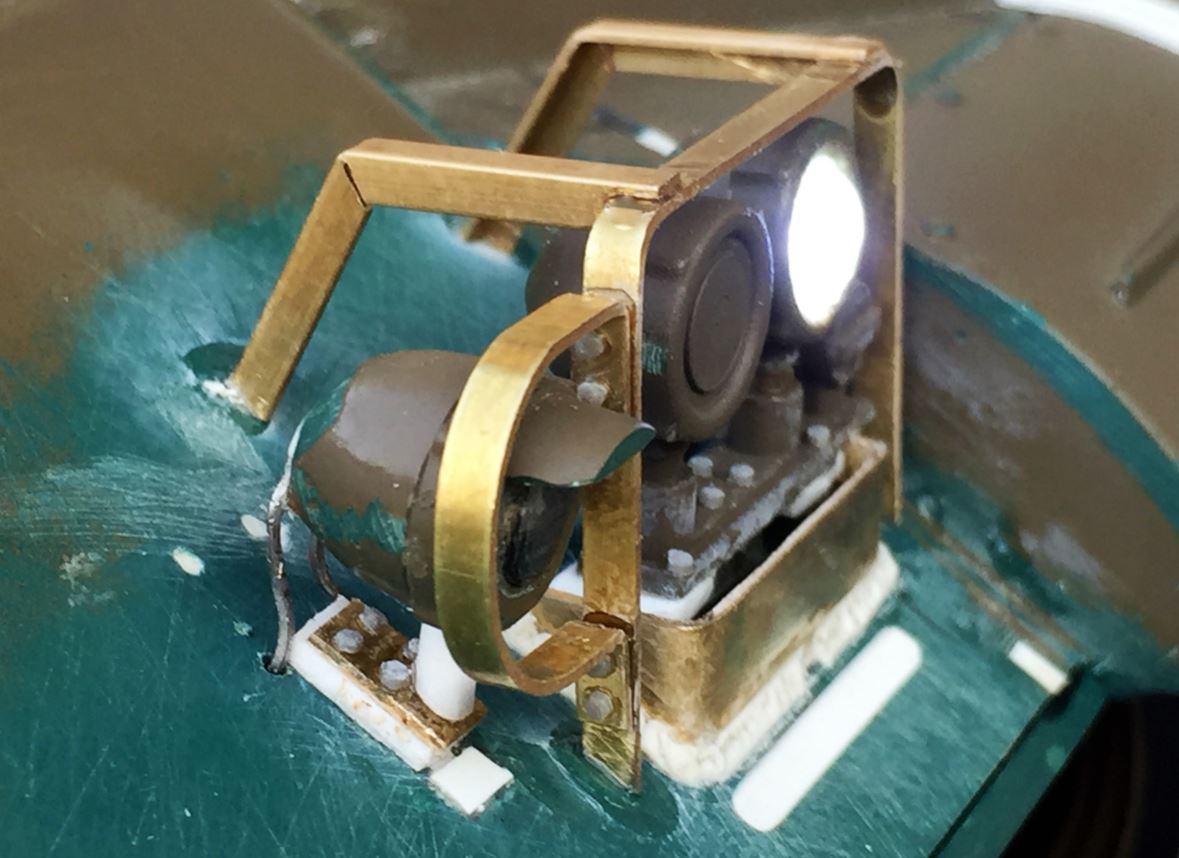 Right headlight and guards. The guards are made in 2mm wide and heavy brass strips, flat for the front and in L shape for the back support. The blackout light on the left is the Heng Long part that was modified, and the LED was reduced in depth with a nail file to be more realistic.