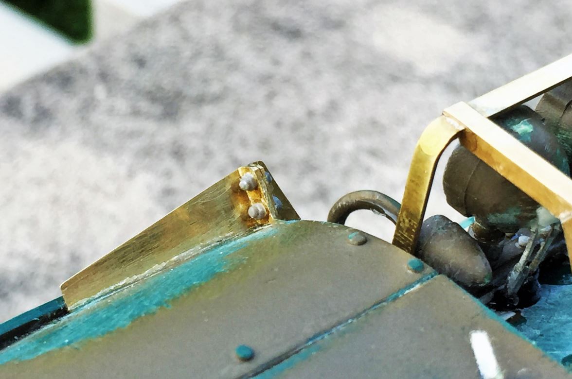The embossed stiffeners were all done in 1mm half round rods. I previously started a week ago with what I thought was 1mm half round but I noticed yesterday that they were actually 1.5mm half round. After some analysis and although my calculator was telling me they were only a bit above the right size, I determined they looked too big. Look is important, so I have removed what I had done and they were redone in 1mm half rods now. Notice the tow cable holders on the side, all hand made in brass as per reference.