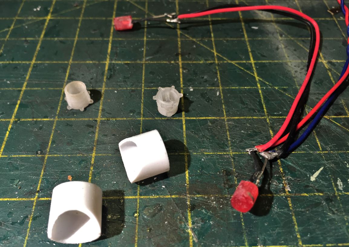 Although I usually put a 3mm LED for tail lights in order to be less bright, the Shapeways lights are designed to house a 5mm LED, so I reused the Heng Long LEDs to fit inside after some sanding.