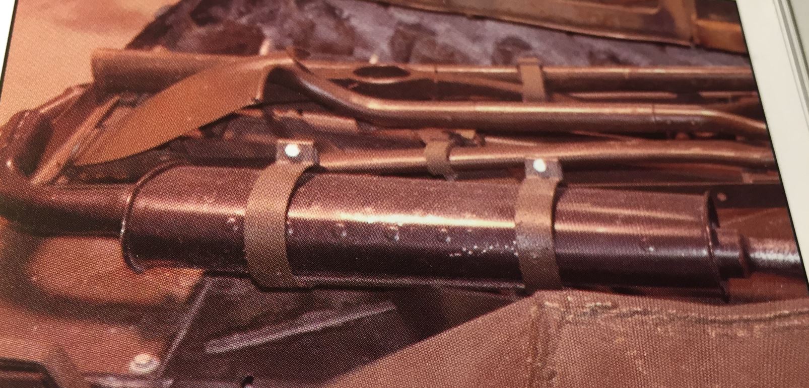 Picture of the muffler arrangement at the front. Notice how loose the two holdings straps are. I did repro the item as I saw it on this picture.