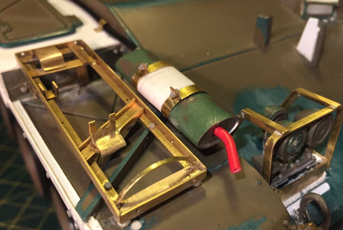 The inaccurate oval shaped fuel cap on the rear plate was earlier removed during the hull construction, and needed to be replaced by a scratch built one that is round, smaller but modelled on the other ones in order to be consistent.