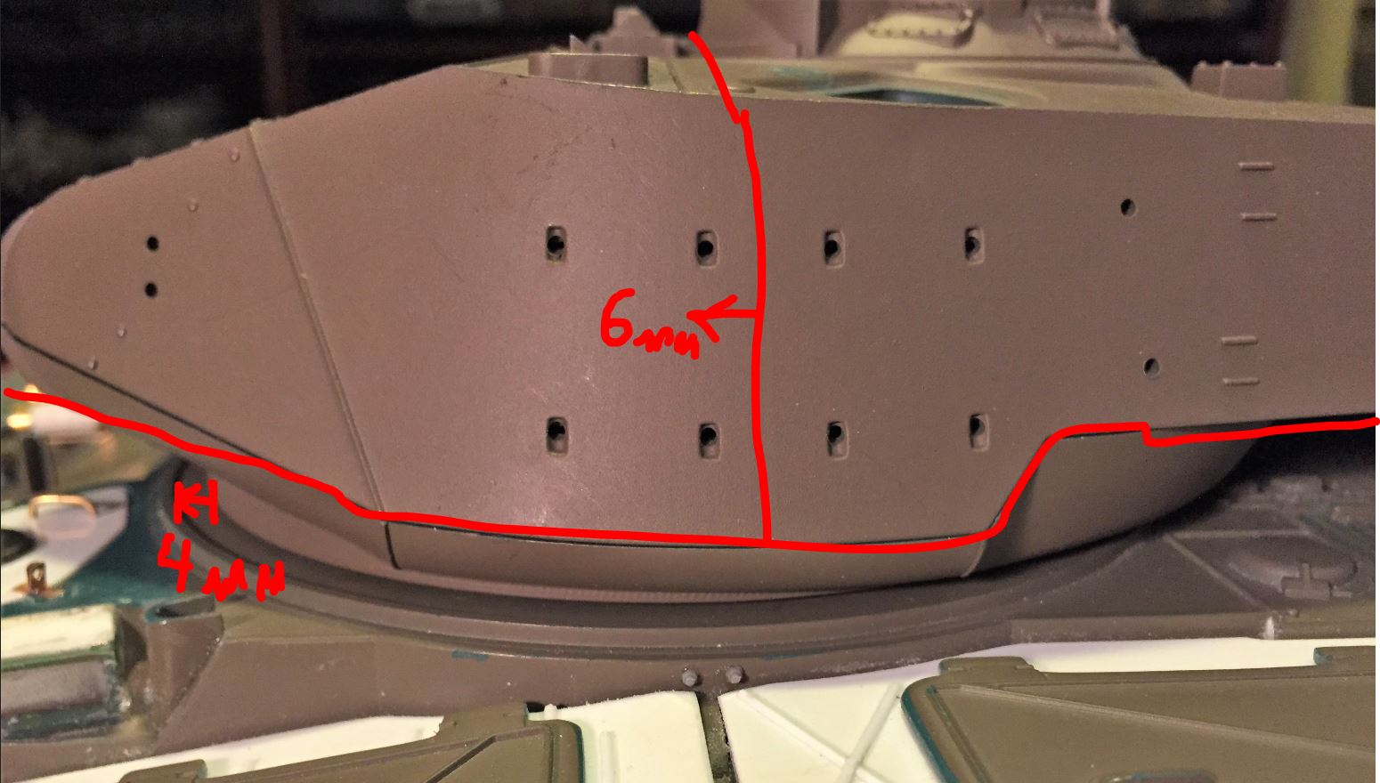 Here you can see how I plan to put the armor from the top to the bottom section using plasticard on top of the old armor. The turret is about 4mm wider on each side, and the armor plates will be at the right angle.