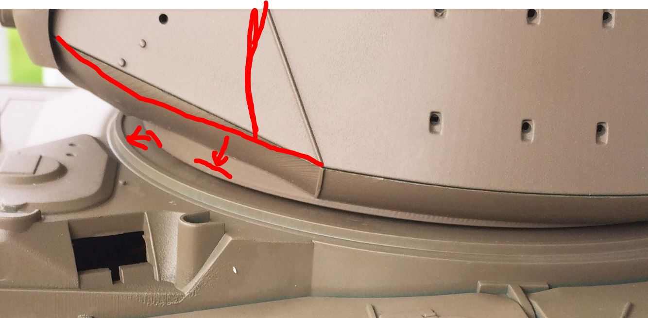 The turret is too narrow by 8mm at the bottom (top is ok) and the side armored plates do not have the right angle, too steep. As I will be extending the turret ring, the new side armored plates will connect to it, solving 2 issues at the same time. The idea is to deal with the source of the issue instead of trying to hide some symptoms. I am going all the way with this one. I always like experimenting with fixes.