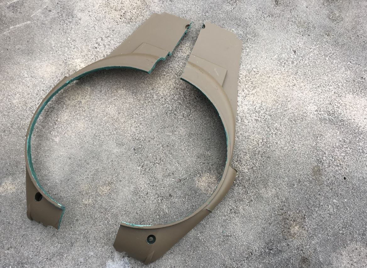 The two halves are glued against the outer ring. The front section above the two lines does not touch the ring and can be ignored at this point. They were left at this stage for positioning purposes and will later be cut because the bottom of the nose need to be totally replaced.