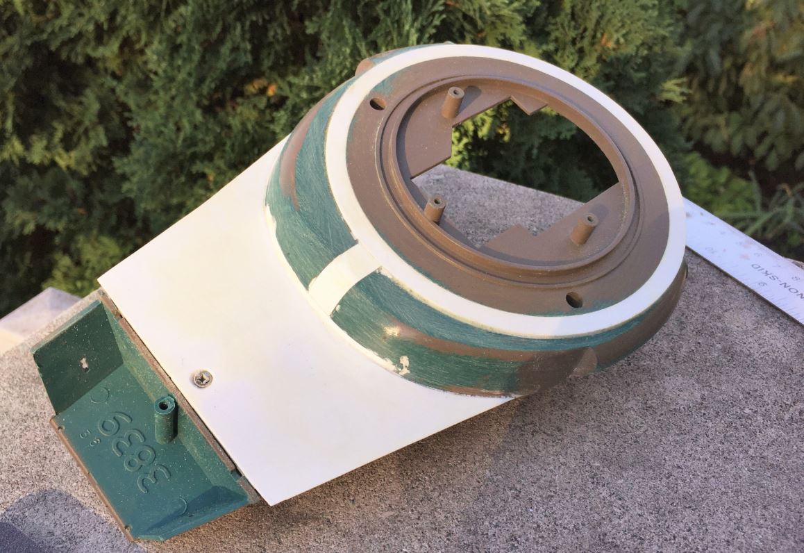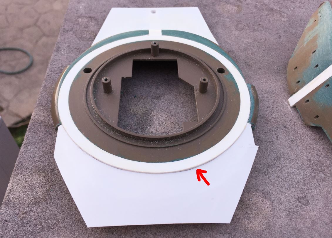 It needs to be repositioned on the new outer ring. The inside of the turret needs to be trimmed to adjust to the new ring, carefully making sure it is still centered and aligned with the back of the turret. It will need to be reassembled with the upper turret part later so everything must be aligned correctly.