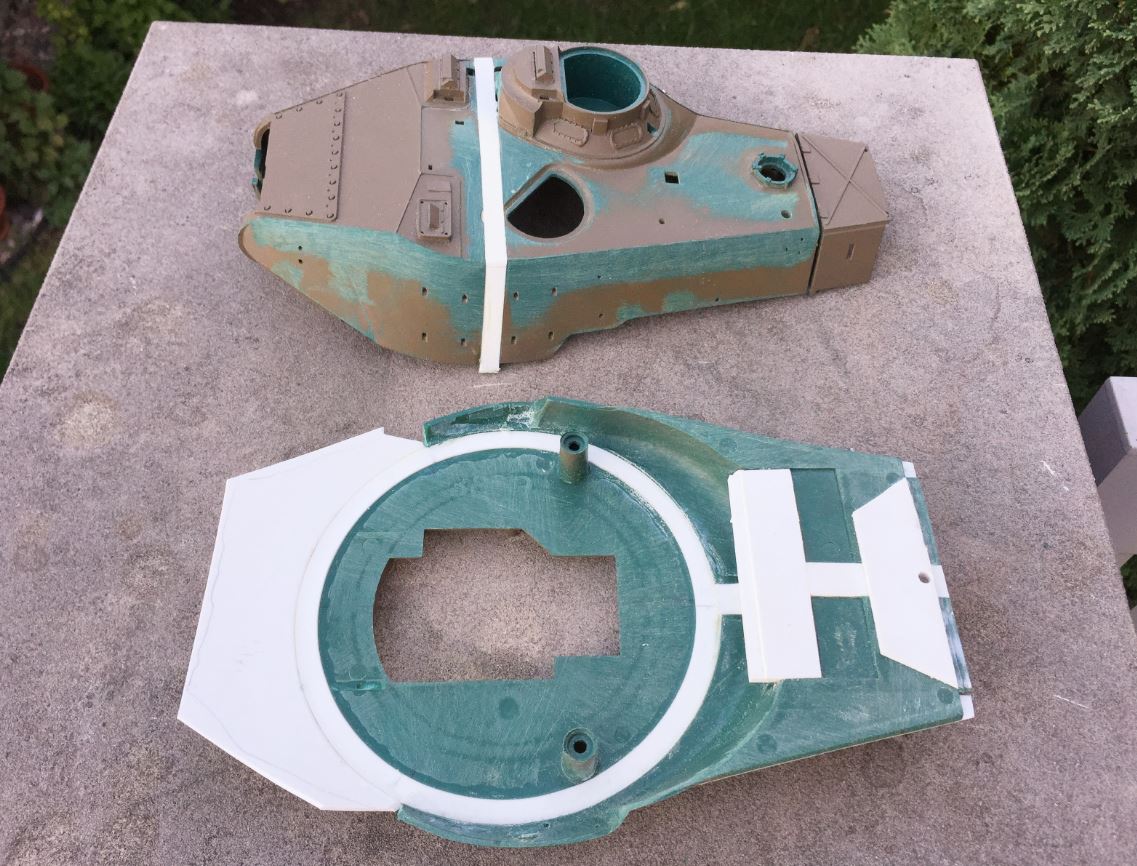 The bottom of the turret rear is remodeled to the new width and the rotation unit bump was removed. It was reinforced internally and the gaps were filled with plasticard sections, and then a thin overlay was added on top and everything sanded smooth for a seamless job.