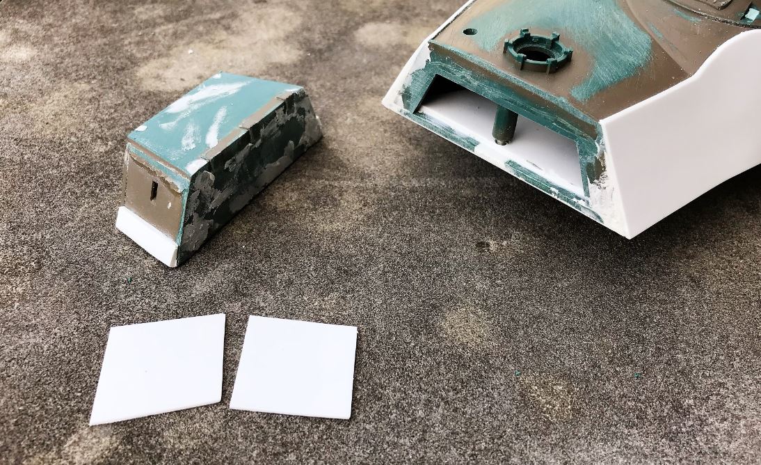 Preparing the turret to install the side armor plates. Strips of various thickness are used to create support the armor. The armor plates need to be glued to each strip but cannot be glued to the bottom section of the turret.