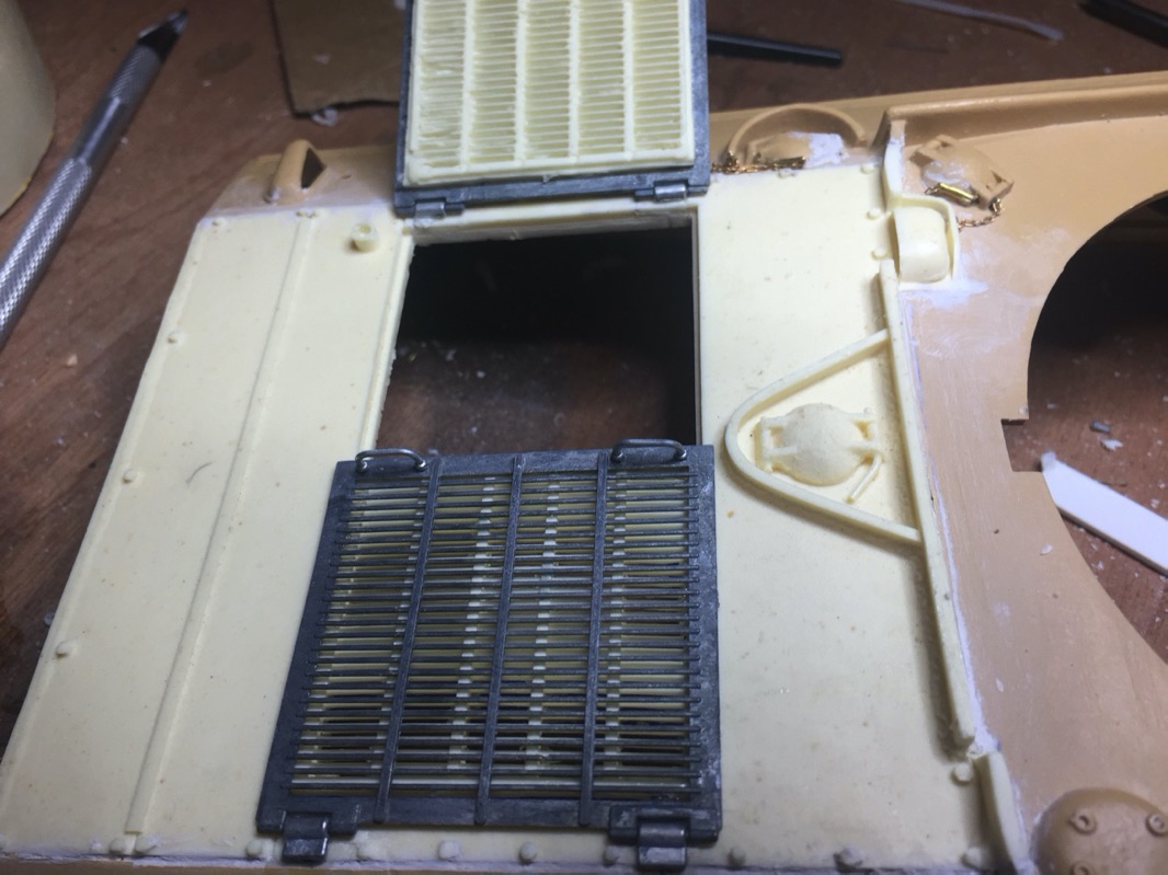 The second mayor upgrade is the replacement of the engine deck. As I wanted to build a M4A3E8 that deck must be replaced. Next to the tower, Nick Aguilar provided me such a deck with two large engine doors. But again you have to cut out all what is not needed.