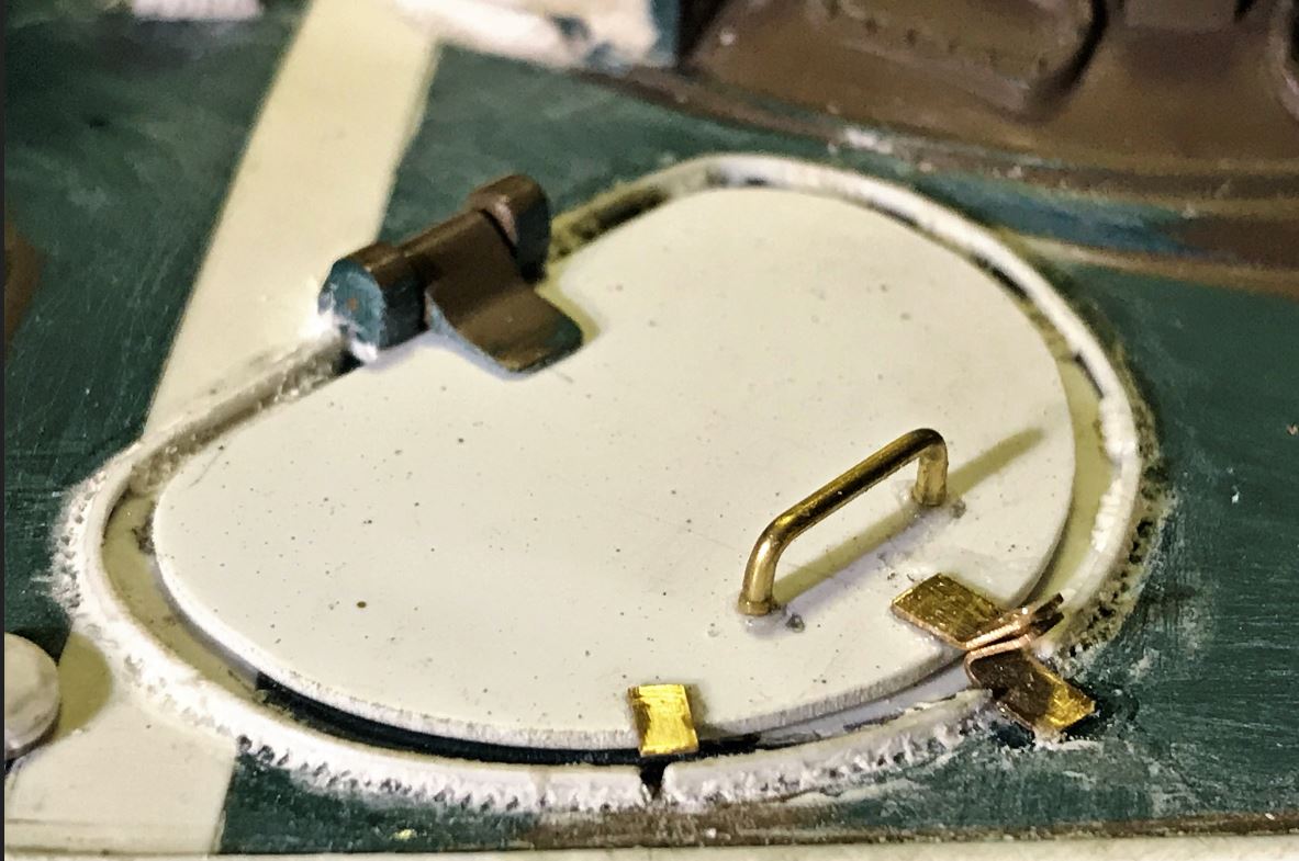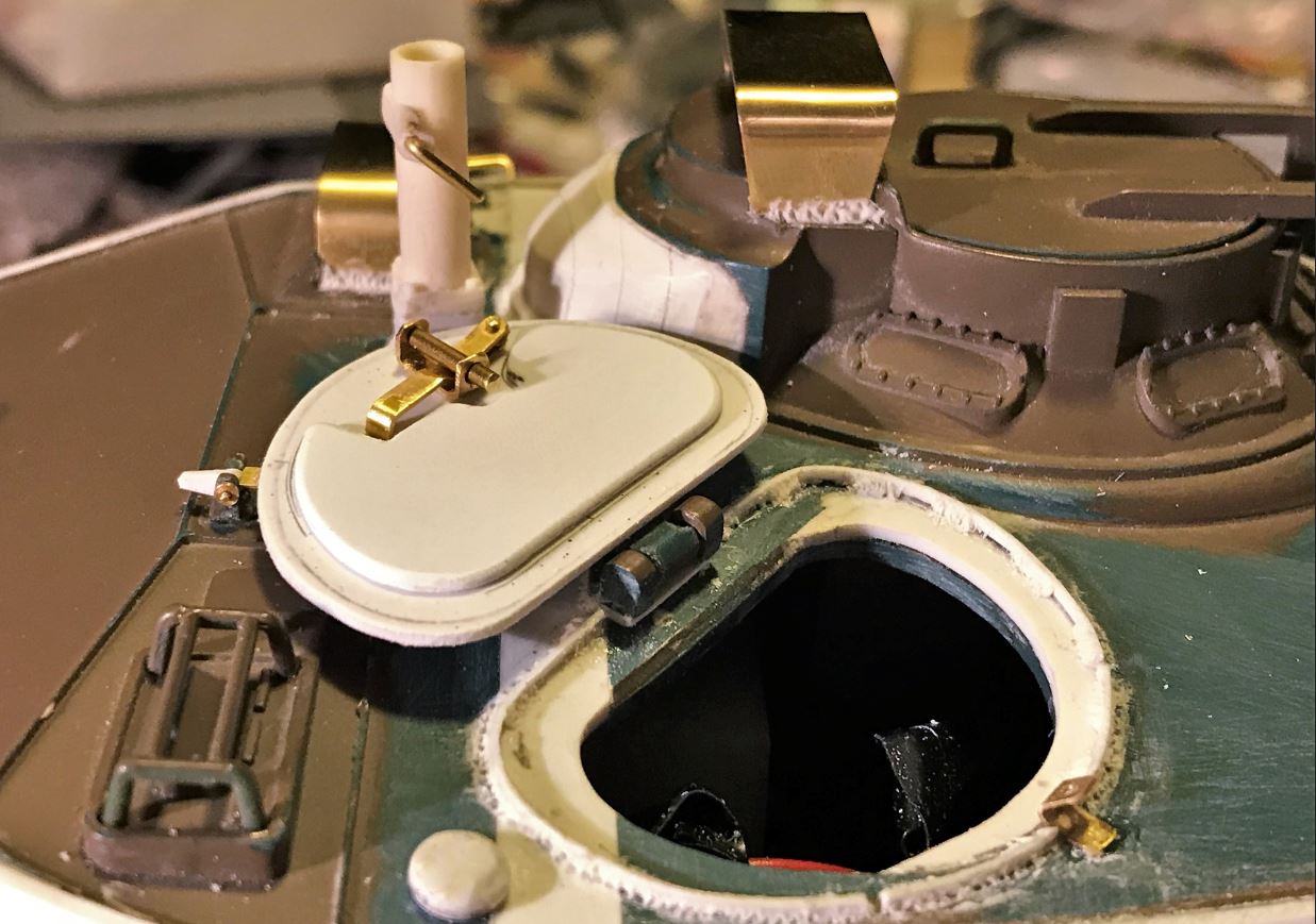 Finishing touch on the loader's hatch. This hatch requires a lot of reference study to get it close to the real thing. I redid the latch for the lock used to lock the tank when the crew is away, it was not at the required angle. Also added the little flat strip that connects to the hatch holder at the front so it needs to be positioned correctly. Heng Long did not... The Heng Long hatch holder part was reused but detailed with a M0.6 bolt and movable latch.