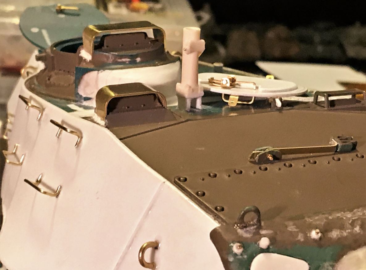 I redid in brass the armored shield for the periscopes. The Heng Long parts were not too bad but the front one had a hole on the right side to make room for the MG mount that was previously on the right of the cupola, and it was also way too high. So, I decided to replace it. In order to show consistent construction, I also did the one in the back with the same process.