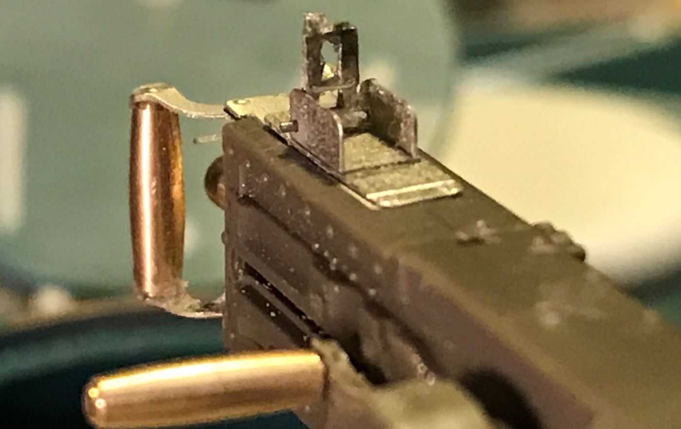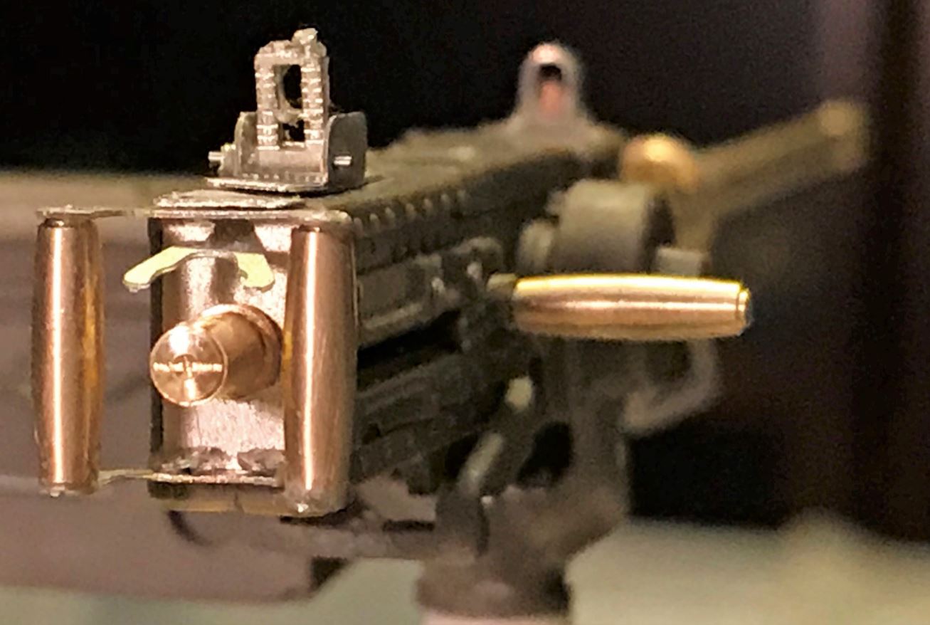 The machine gun back sight looks good and can be raised or lowered. The front sight is a challenge to make... you just need to take your time and do and undo it until you are satisfied. The 0.3mm bit can become handy again in making the pin in the middle of the front sight. I used a sanded down brass 0.5mm rod section because the front sight was done before the rear sight solution was designed.